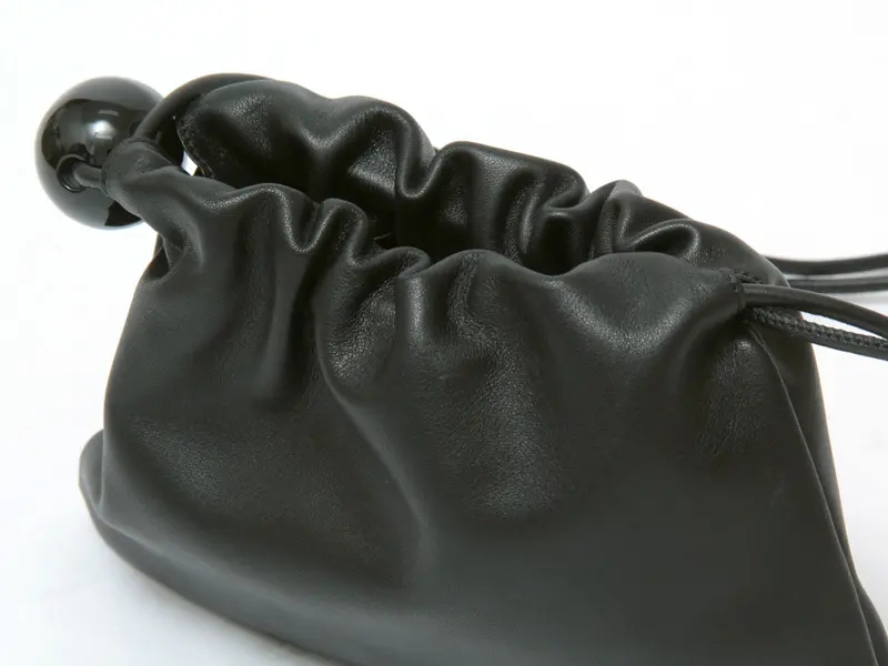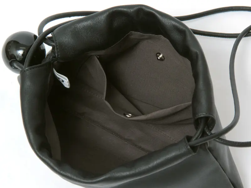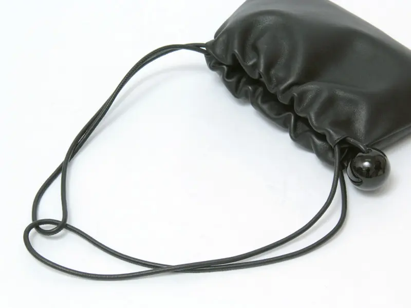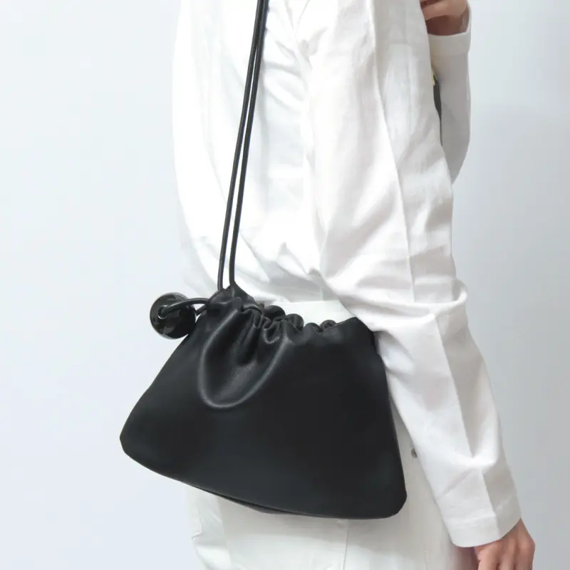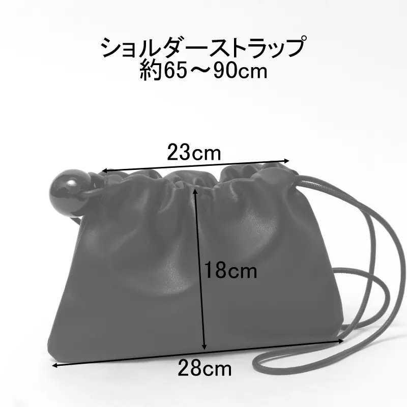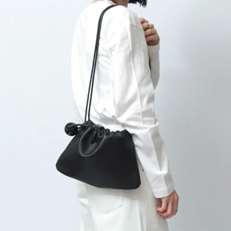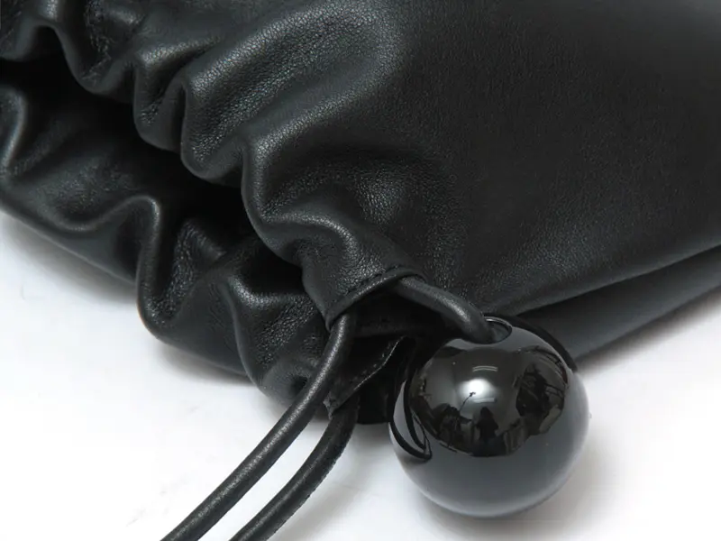 本体には、しっとりとなめらかな手触りの羊革を使用。軽やかで柔らかな質感が、巾着ならではドレープと丸みのあるフォルムを美しく引き立てます。肩に掛けたときも自然に身体に馴染み、やさしいラインを描きます。オリジナルのポリエステル樹脂製ボールチャームは、ミニマルなデザインの中で際立つアクセント。ボール玉の艶やかな質感と、羊革の上質な風合い。そのコントラストが、シンプルなデザインの中にさりげない遊び心を添えます。
