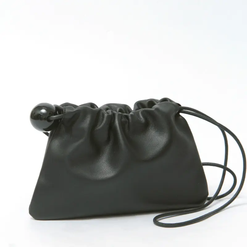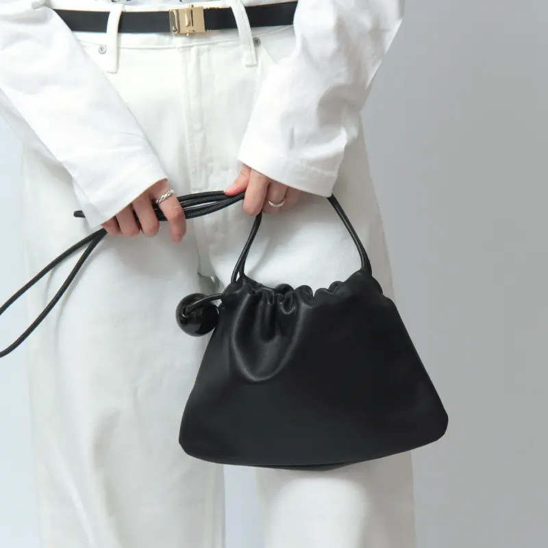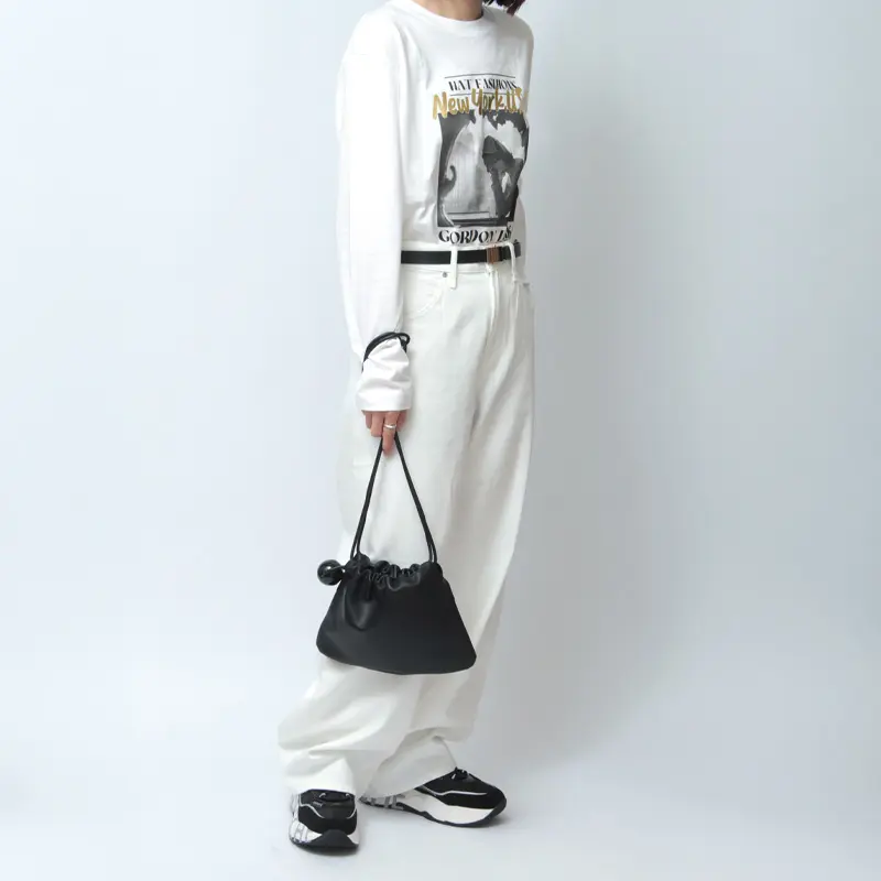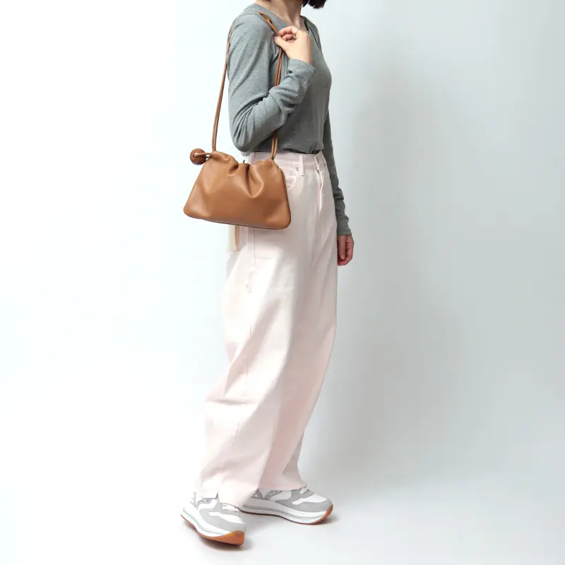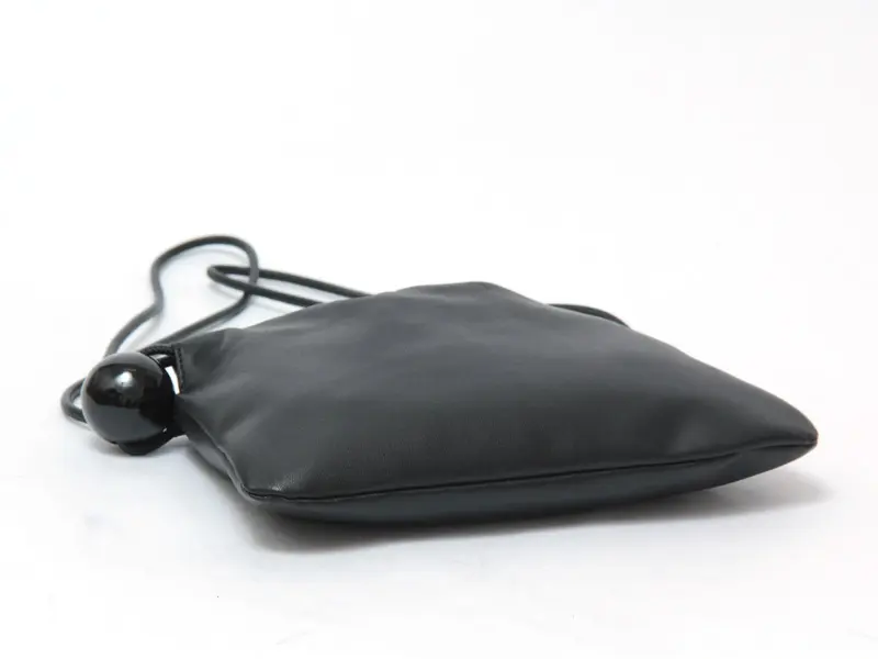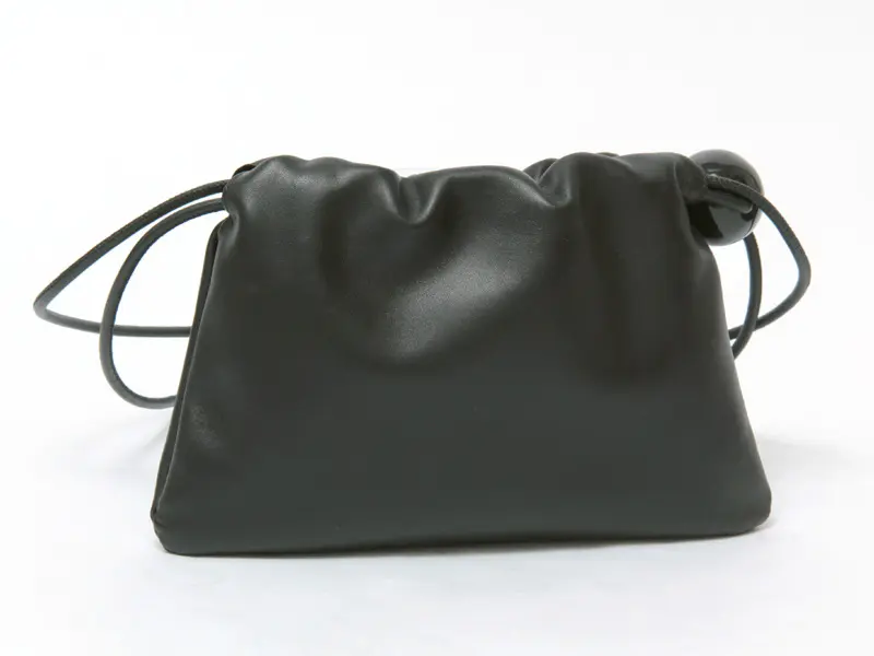 本体には、しっとりとなめらかな手触りの羊革を使用。軽やかで柔らかな質感が、巾着ならではドレープと丸みのあるフォルムを美しく引き立てます。肩に掛けたときも自然に身体に馴染み、やさしいラインを描きます。オリジナルのポリエステル樹脂製ボールチャームは、ミニマルなデザインの中で際立つアクセント。ボール玉の艶やかな質感と、羊革の上質な風合い。そのコントラストが、シンプルなデザインの中にさりげない遊び心を添えます。