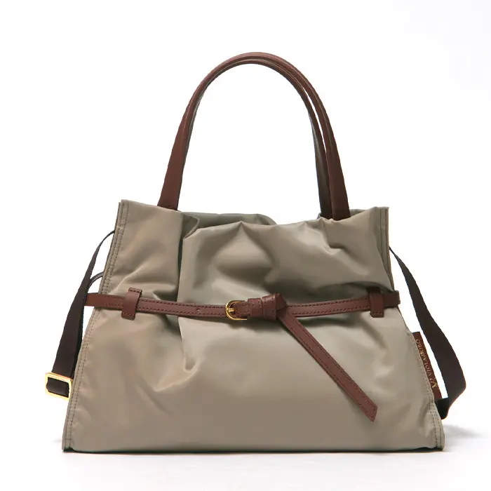 カジュアルなナイロン素材に、レザーのベルト使いを効かせた、大人女性が品よく持てるVIOLAd’ORO(ヴィオラドーロ)のトートバッグ。光沢を抑えたマットなナイロンを使用し、ふわりと体に馴染む柔らかな質感と、ゆとりのあるシルエットは、きれいめでありながら気負わず持てる仕上がり。レザーベルトを効かせることで、カジュアルになりすぎず品よく持てます。軽量で扱いやすく、きれいめスタイルからデイリーまで幅広いシーンで活躍する日本製の2wayトートです。