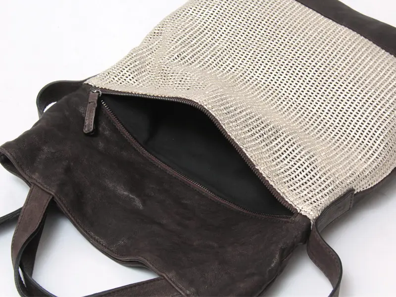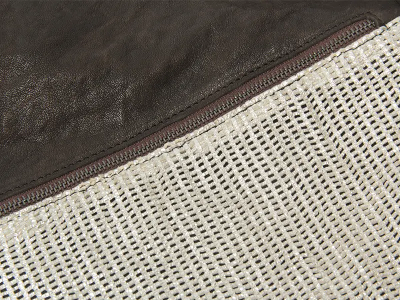 柔らかく風合い豊かなイタリア製100%シープスキンを贅沢に使用。自然なしわ感がレザー本来の奥行きを生み出し、手に取るたびに上質さを実感できます。前面のゴールドメッシュは光を受けて上品にきらめき、シンプルながらも華やかで洗練された印象を演出する本革バッグです。