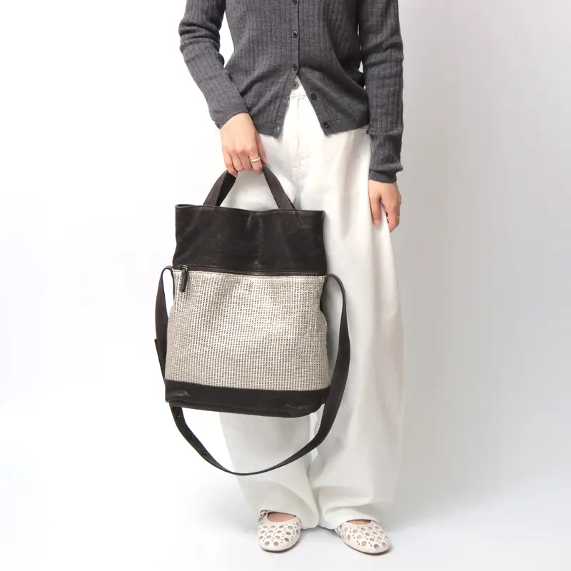 イタリア発レザーブランド、Alchimia(アルキミア)の2wayトートバッグ「OSAKA」。柔らかな100%羊革を使用し、レザー本来の自然な風合いが魅力。使うほどに味わい深く表情を変え、上品で洗練された印象を演出します。ダークブラウンのボディに前面ゴールドメッシュの切り替えをあしらい、シンプルながらも個性的なデザイン。バッグを折りたたむとショルダーバッグとしても使える2way仕様で、日常からお出かけまで、大人のコーディネートに自在にフィットします。
