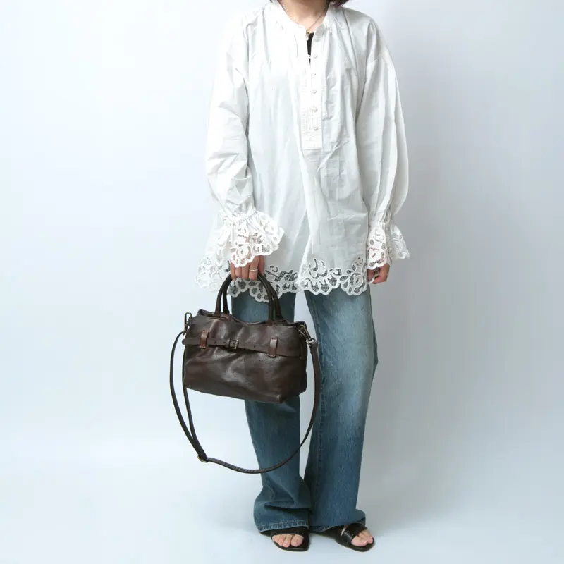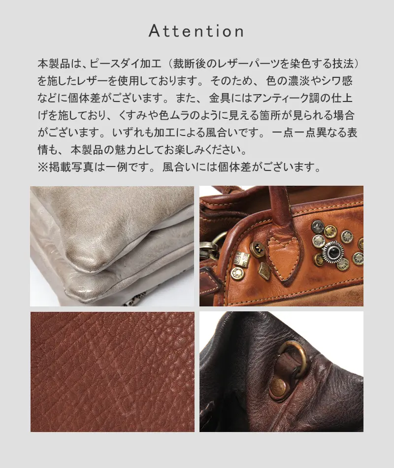 イタリア製 100%カーフレザーにピースダイ加工を施し、自然な色の濃淡と奥行きある風合いを引き出しました。裁断後に染色するピースダイにより、一点ごとに異なるニュアンスカラーが楽しめるのも魅力です。柔らかな質感で、触れるたびにレザーの表情を感じられる上品なバッグに仕上がっています。