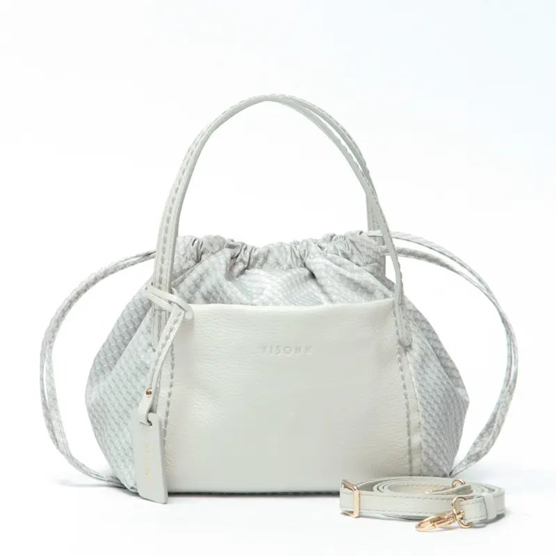 ハンドルには、VISONAのアイコンであるステッチが施されています。ブランドロゴをあしらったバッグチャームは取り外し可能で、上品なアクセントとしてさりげない存在感を添えます。
