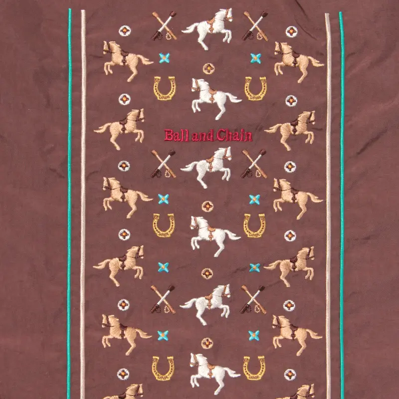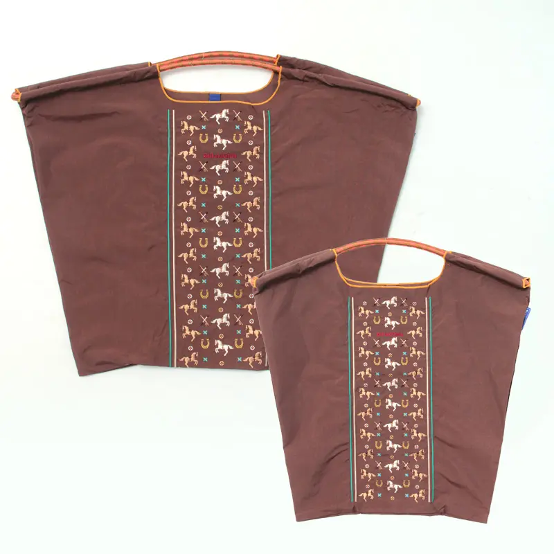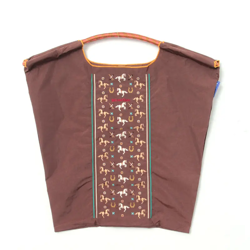Ball & Chain(ボールアンドチェーン)のデザインチームが手掛けたオリジナルシリーズのエコバッグ「HORSE LINE(ホースライン)」。馬や馬蹄のモチーフを散りばめ、ヴィンテージスカーフのような印象的な刺繍デザインに仕上げています。幸運を呼び込むラッキーモチーフとされる馬蹄を取り入れたデザインも魅力。シックなダークブラウンのチョコカラーが刺繍の存在感を引き立て、コーディネートに落ち着いたアクセントを添えます。