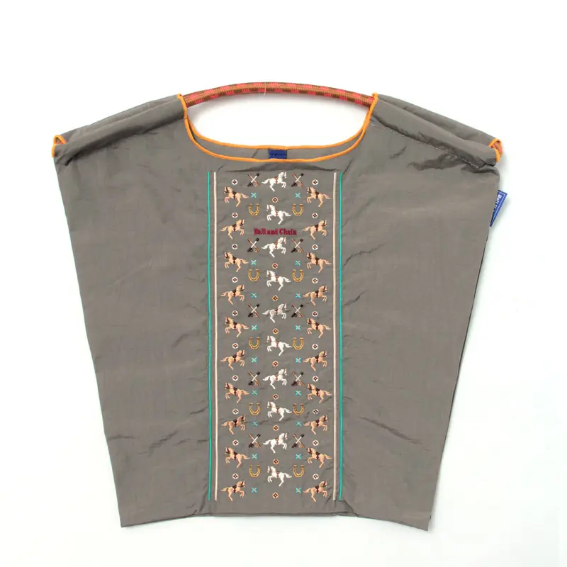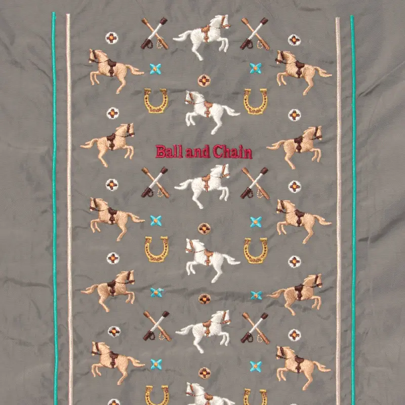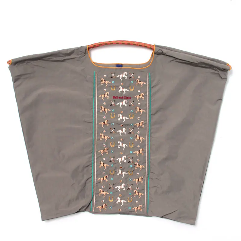 Ball & Chain(ボールアンドチェーン)のデザインチームが手掛けたオリジナルシリーズのエコバッグ「HORSE LINE(ホースライン)」。馬や馬蹄のモチーフを散りばめ、ヴィンテージスカーフのような印象的な刺繍デザインに仕上げています。幸運を呼び込むラッキーモチーフとされる馬蹄を取り入れたデザインも魅力。シックなグレーカラーが刺繍の存在感を引き立て、コーディネートに落ち着いたアクセントを添えます。