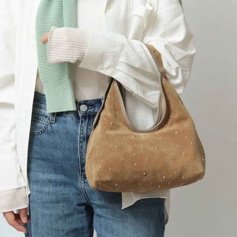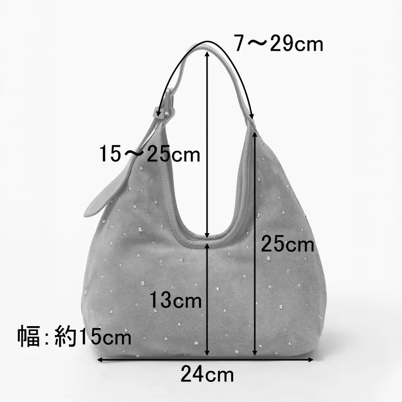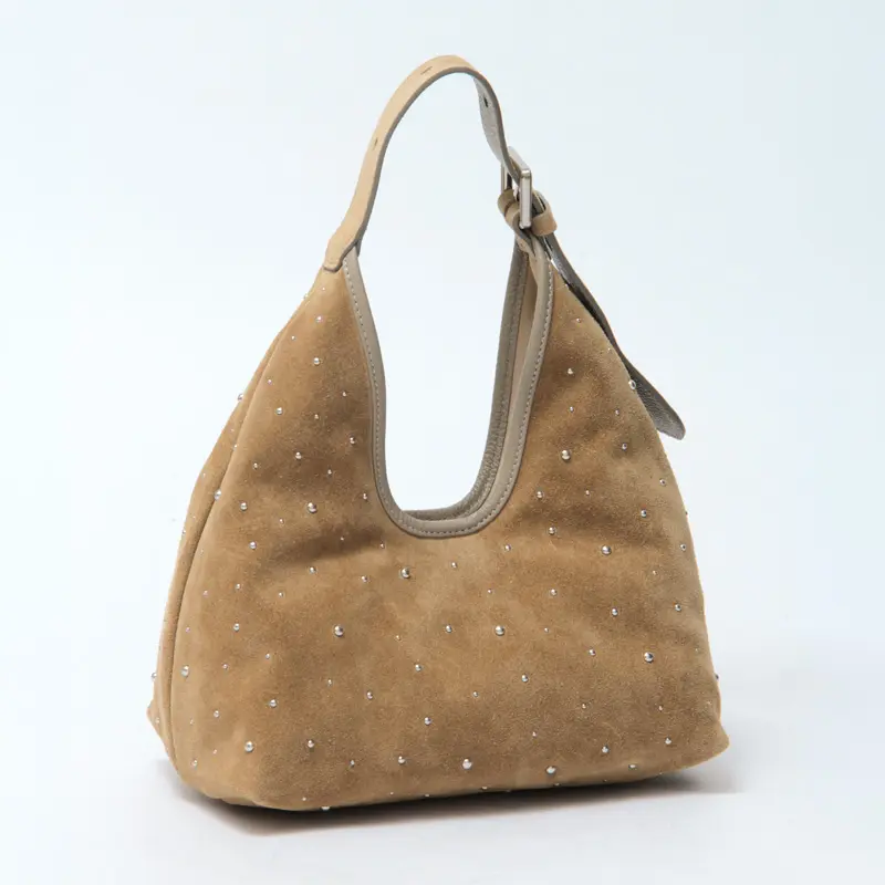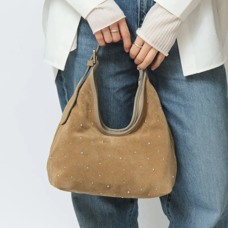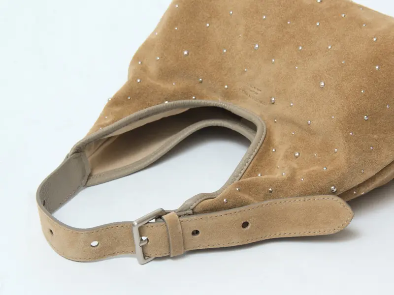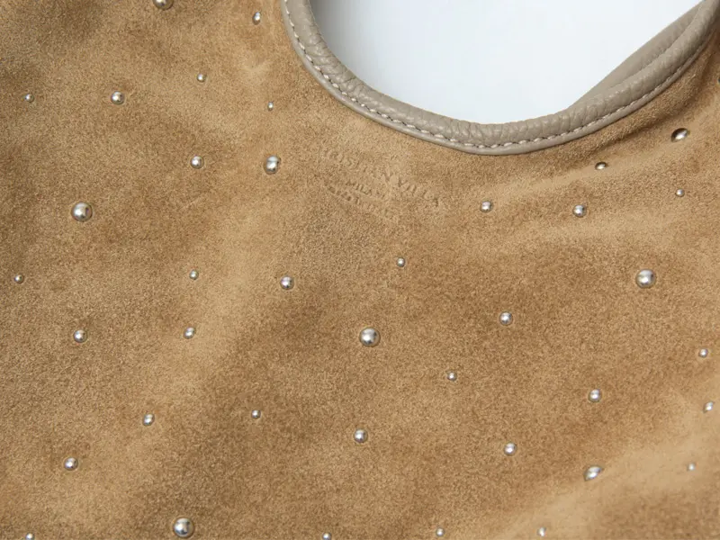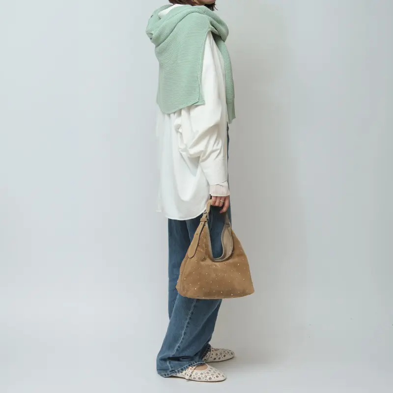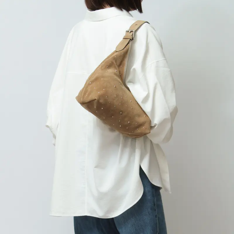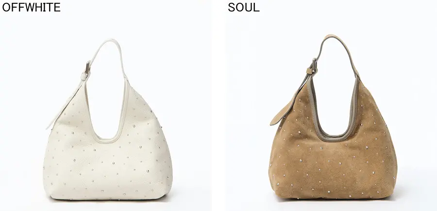 控えめなスタッズがデザインにこなれ感を与え、シンプルな中に華やぎを演出。薄手のレザーを使用し、見た目以上に軽やかで柔らかな質感が体になじむため、毎日のスタイルにさっと取り入れられるレザーバッグです。