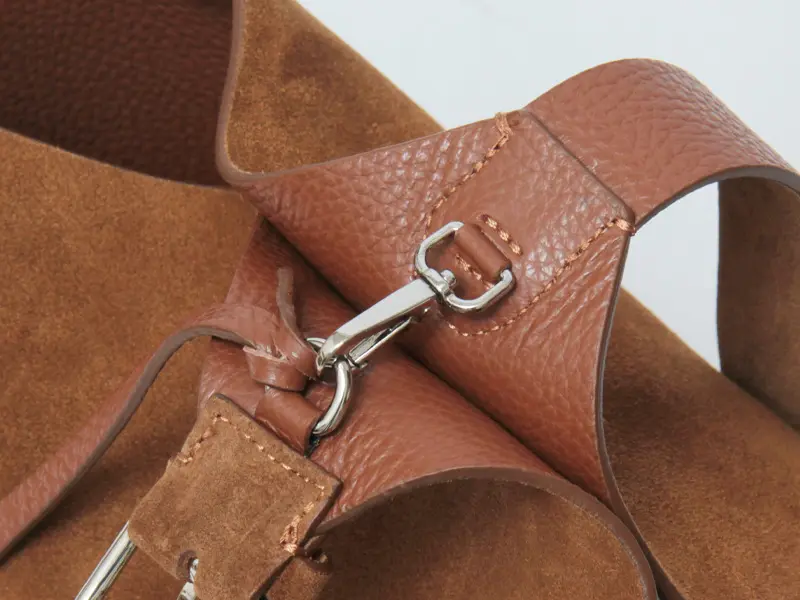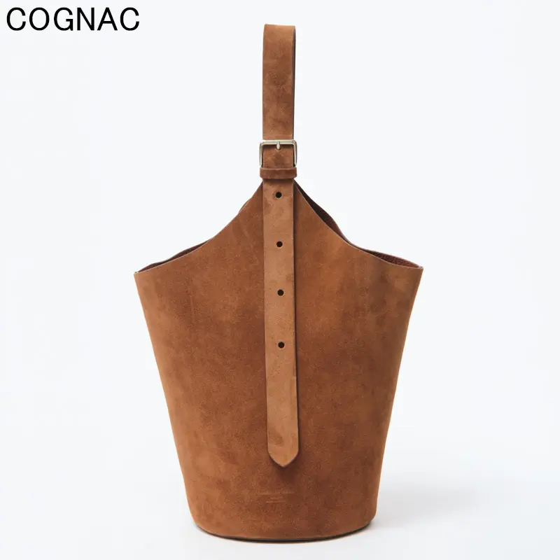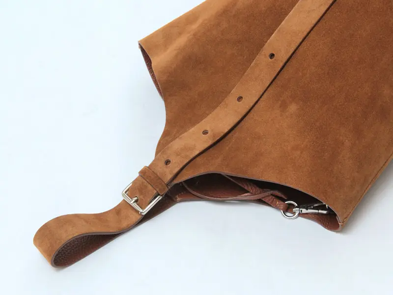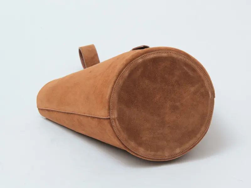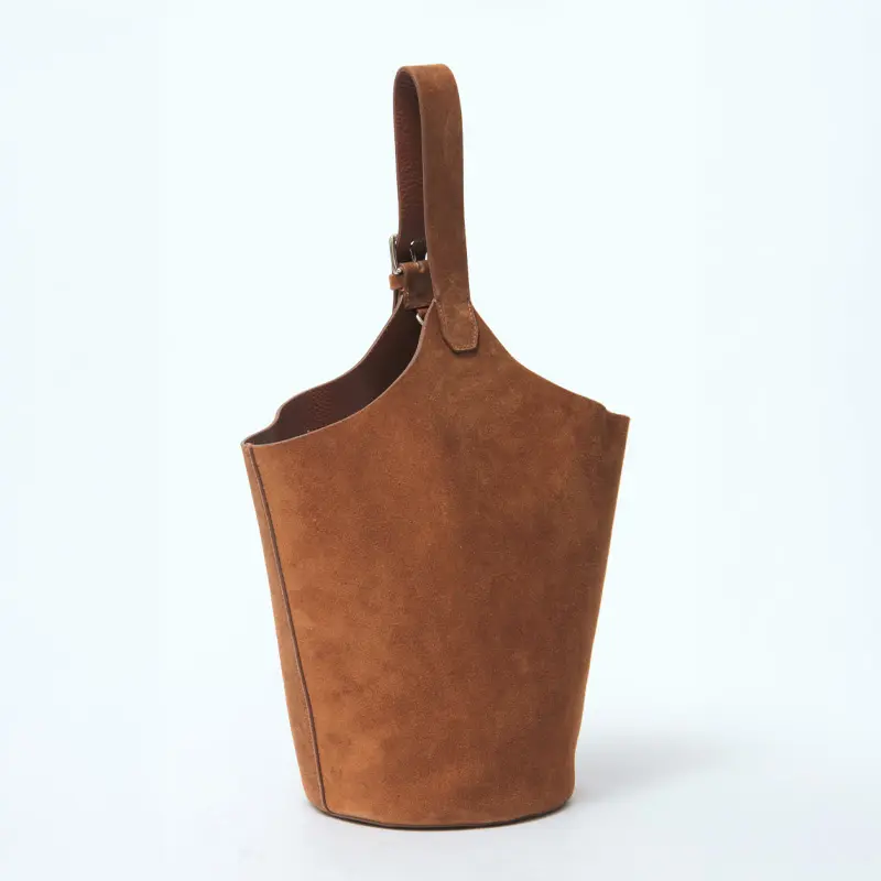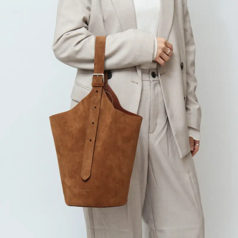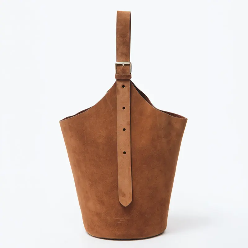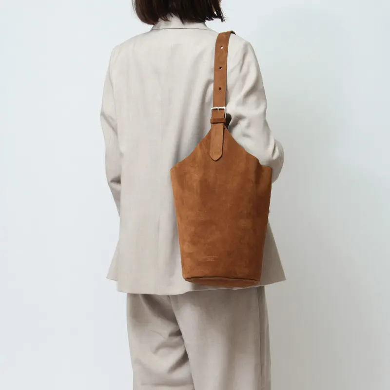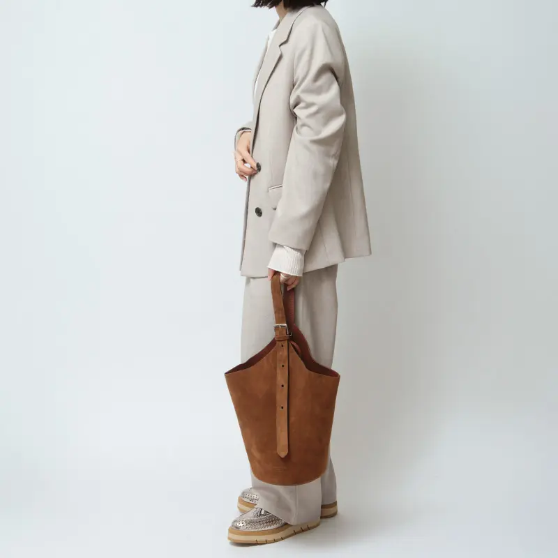 素材には、やわらかな質感が魅力のスエードを使用。手触りの良いなめらかな風合いが、バッグ全体に上品で落ち着いた印象を与えます。深みのあるブラウンカラーは、カジュアルからきれいめまで幅広いスタイリングに馴染みやすいのも魅力。シンプルなコーディネートに取り入れるだけで、ほどよい存在感をプラスしてくれるバケツバッグです。