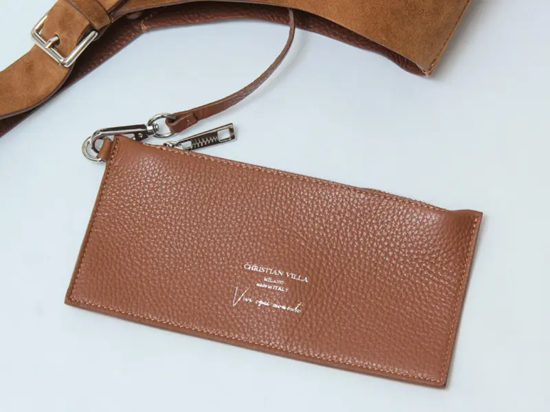 ポケットはありませんが、取り外し可能なレザーポーチが付属しており、ICカードやリップなどの小物を整理して収納できます。