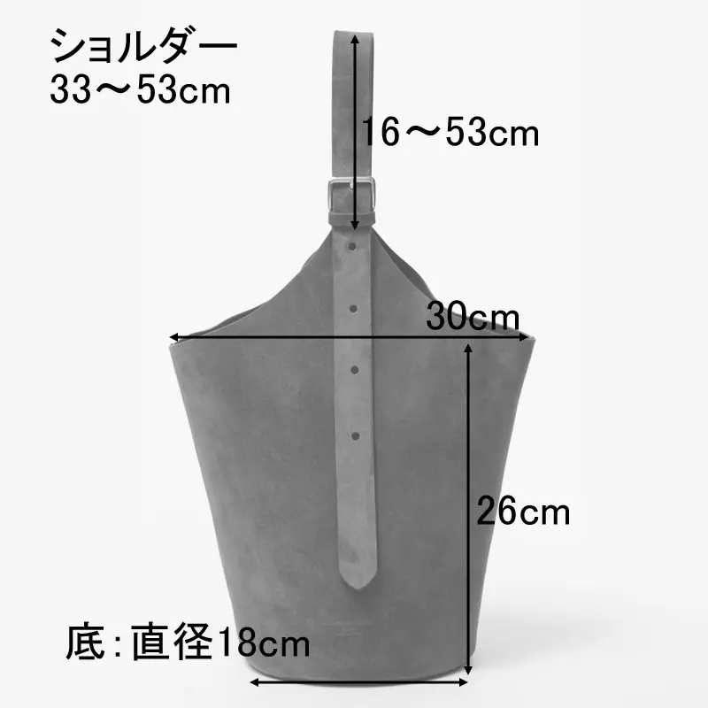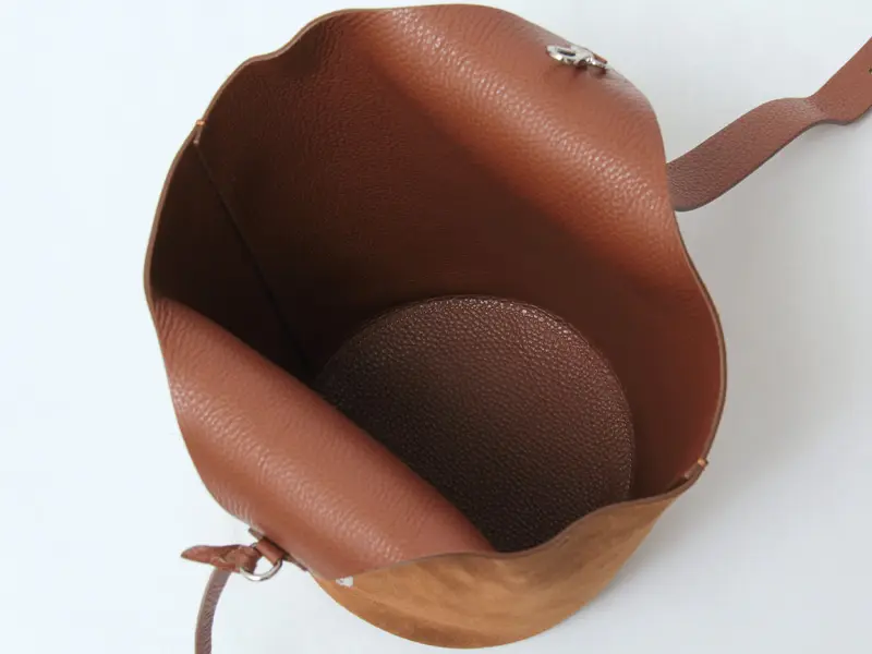 必需品に加えて、ペットボトルや折り畳み傘なども縦に収納できる使いやすいサイズ感。底が円形のバケツ型の縦長フォルムで、荷物をすっきりと収めることができます。バッグは一枚革仕立てで裏地がなく、内側もレザー仕様。やわらかな素材感で軽やかな仕上がりです。