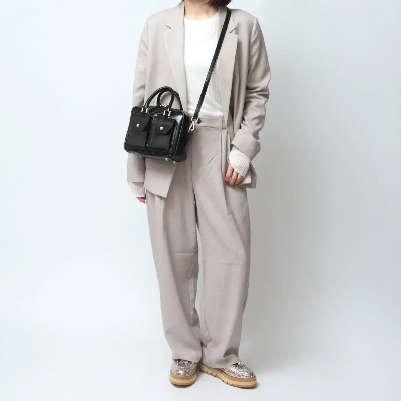バッグには上質なレザーを使用。エナメルのように強すぎない、ほどよい光沢感があり、コーディネートに上品な印象をプラスしてくれます。なめらかな質感のレザーがミニサイズのフォルムを美しく引き立て、シンプルながらも洗練された雰囲気に。カジュアルからきれいめまで幅広いスタイリングに合わせやすく、大人のデイリーバッグとして活躍します。
