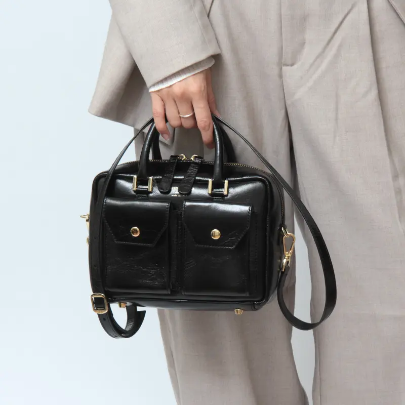 さらに正面にはダブルポケットを備えており、さっと取り出したいアイテムの収納にも便利。デザイン性と使いやすさを兼ね備えたミニボストンバッグです。
