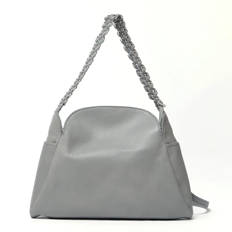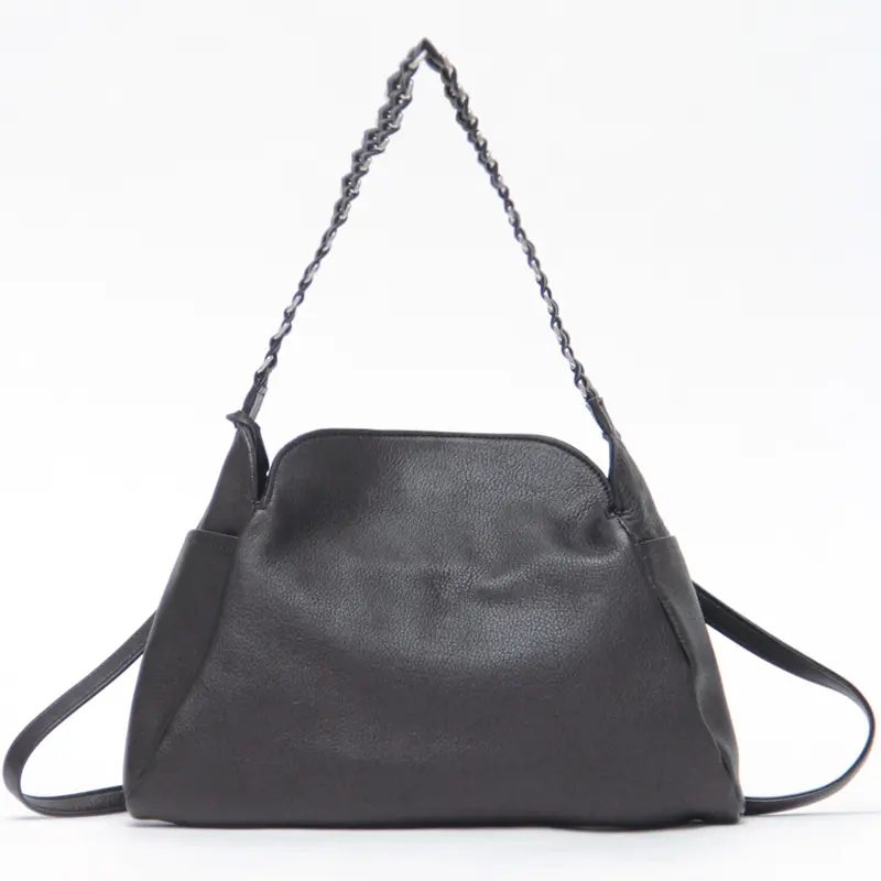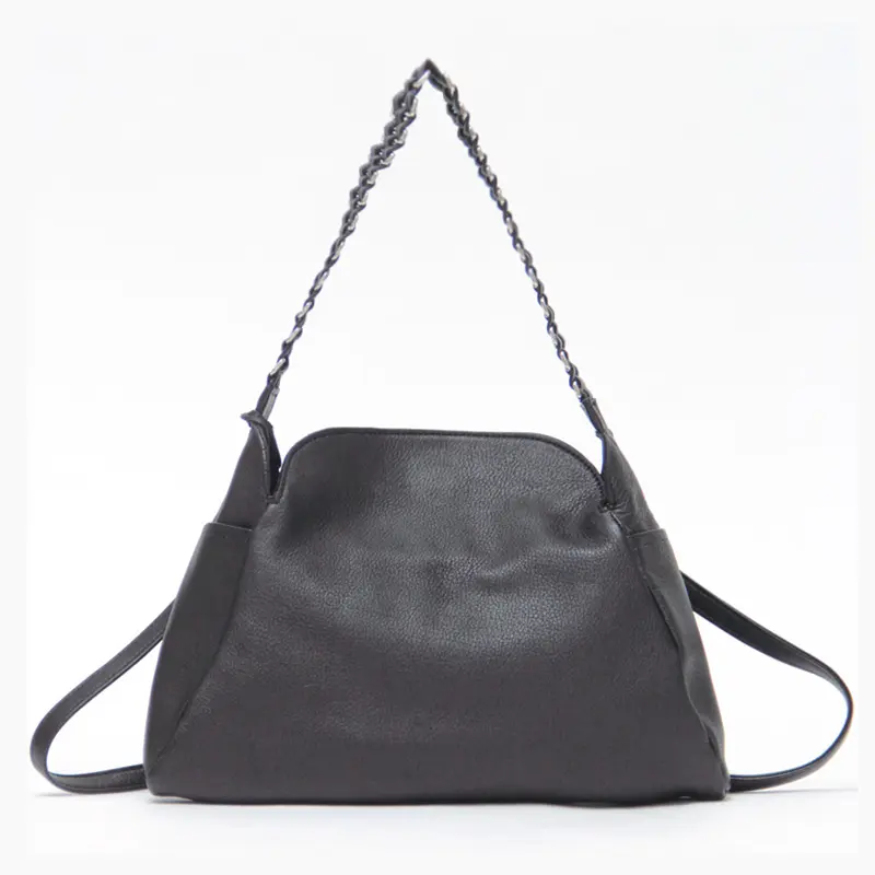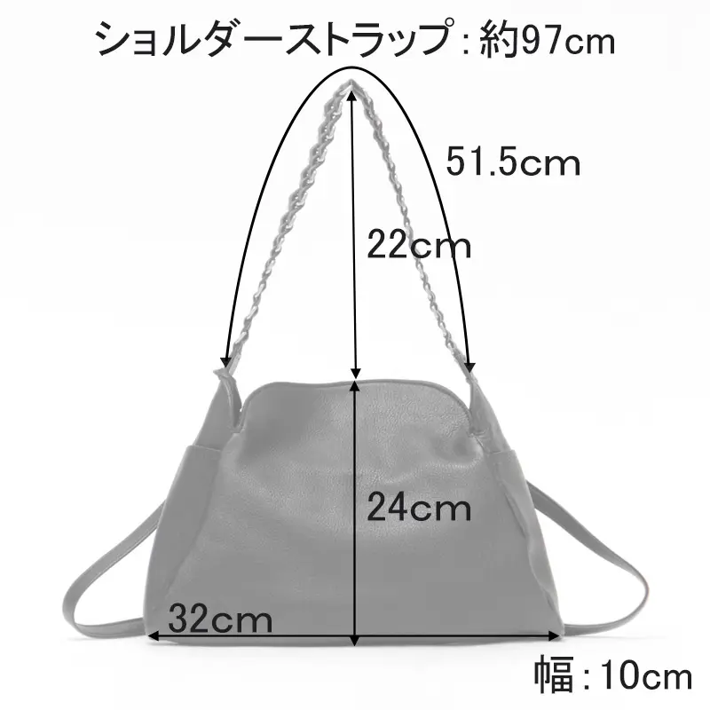 柔らかいレザーにメタルチェーン風ディテールのハンドルが、シンプルながらも印象的で、スタイリングに華やかさをプラスしてくれます。クラシカルなシルエットにモードなアクセントを添え、オフィスにもカジュアルにも溶け込み装いにさりげない品格をプラスしてくれます。