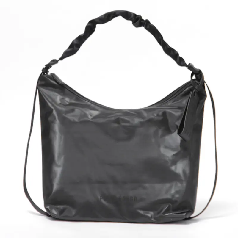 クシュクシュとしたハンドルが可愛いホーボーバッグ。調節することで斜めがけできる長さになるのでクロスボディにしたりと、スタイルに合わせて使い分けられます。軽くて使いやすく、街歩きにもお仕事バッグにもなじむ、上質感とミニマルさが魅力。毎日のお出かけに、品よく寄り添ってくれる頼れる存在です。