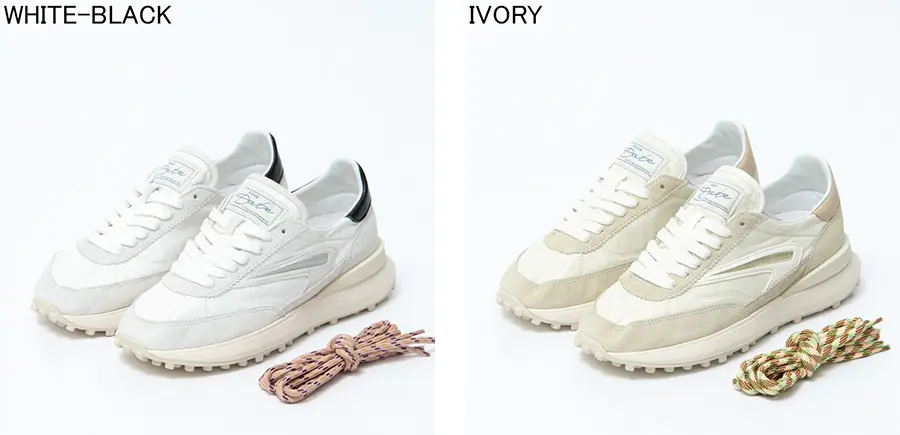 アッパーにはナイロンとスエード、メタリックを組み合わせた異素材デザインを採用。質感の異なる素材がアクセントとなり、シンプルなカラーの中に立体感のある表情を生み出しています。使用されている素材はすべてイタリア製です。