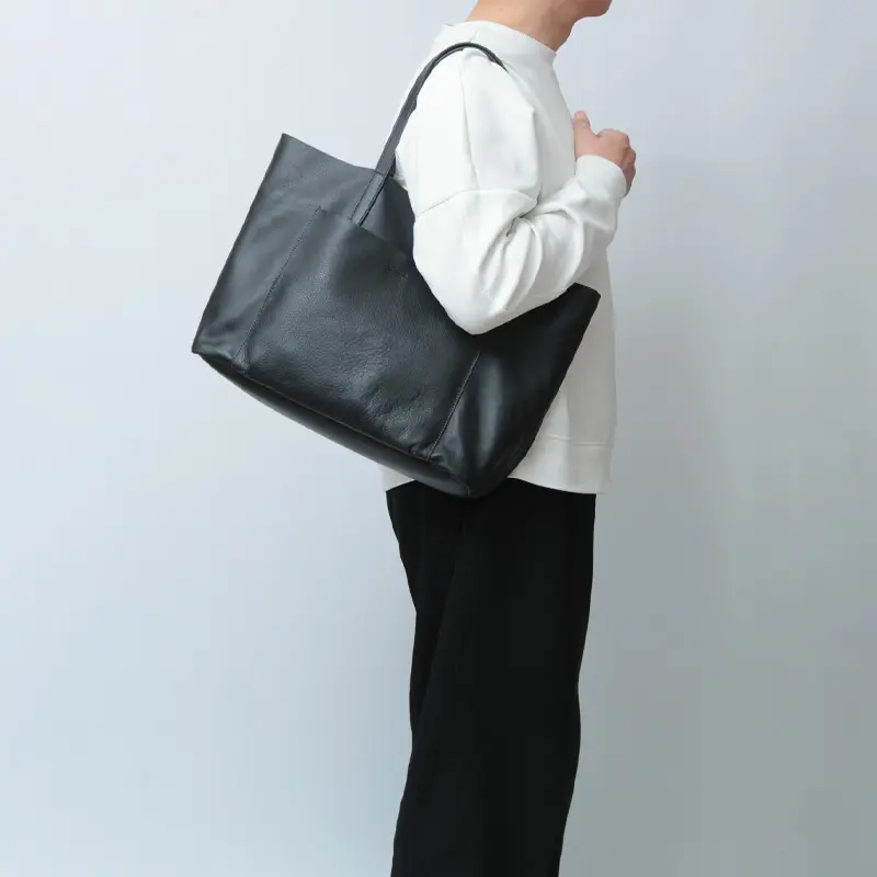 もたつくことなくスムーズに肩掛けができる絶妙なハンドルの長さ。身体のラインに寄り添う柔らかなシルエットが、大人の余裕を感じさせる洗練された佇まいを演出します。軽さを追求した本体に対し、ハンドルは手馴染みが良く、しっかりと厚みを持たせた堅牢な作りに。重い荷物を支える安心感と、手にするたびに感じる上質さが両立します。