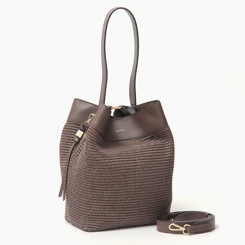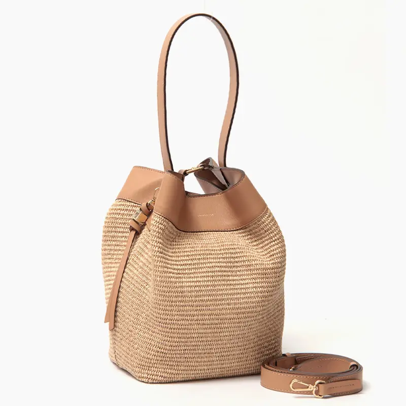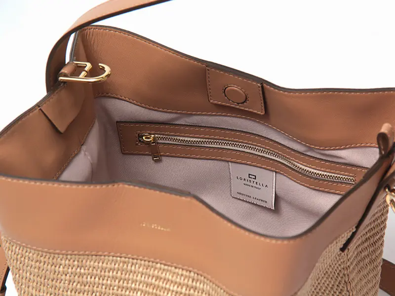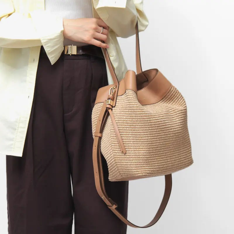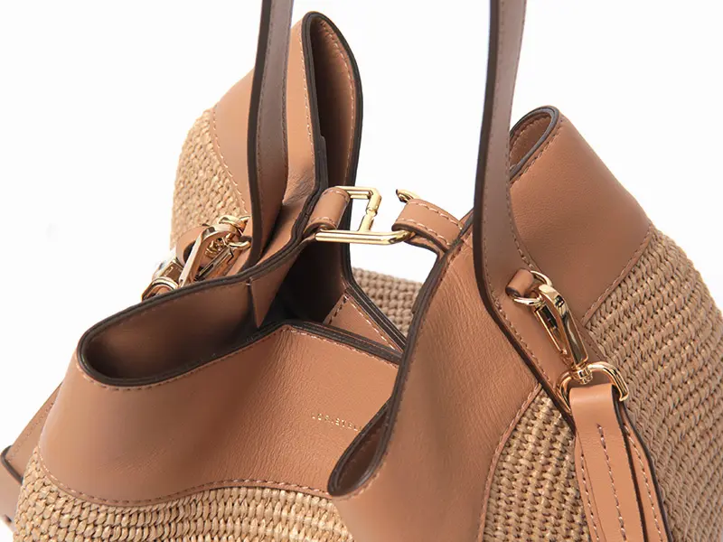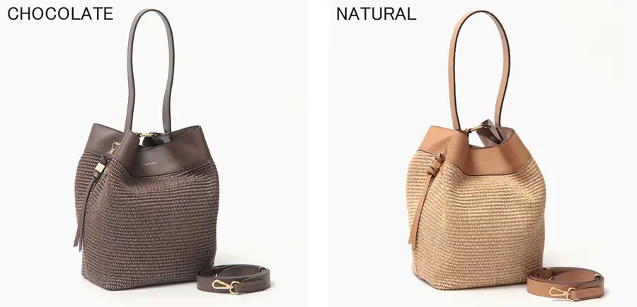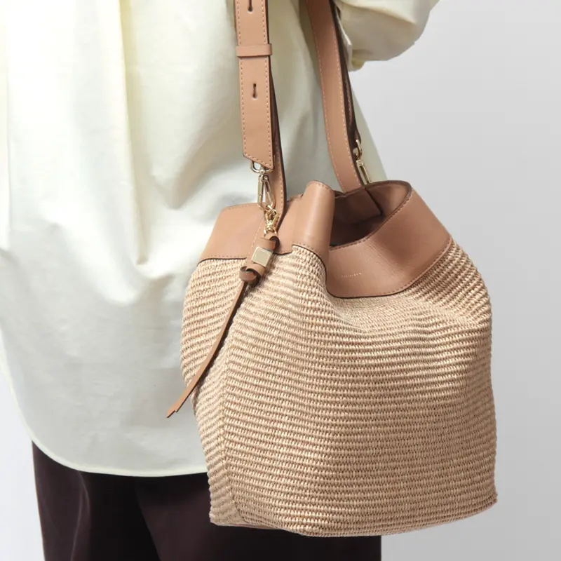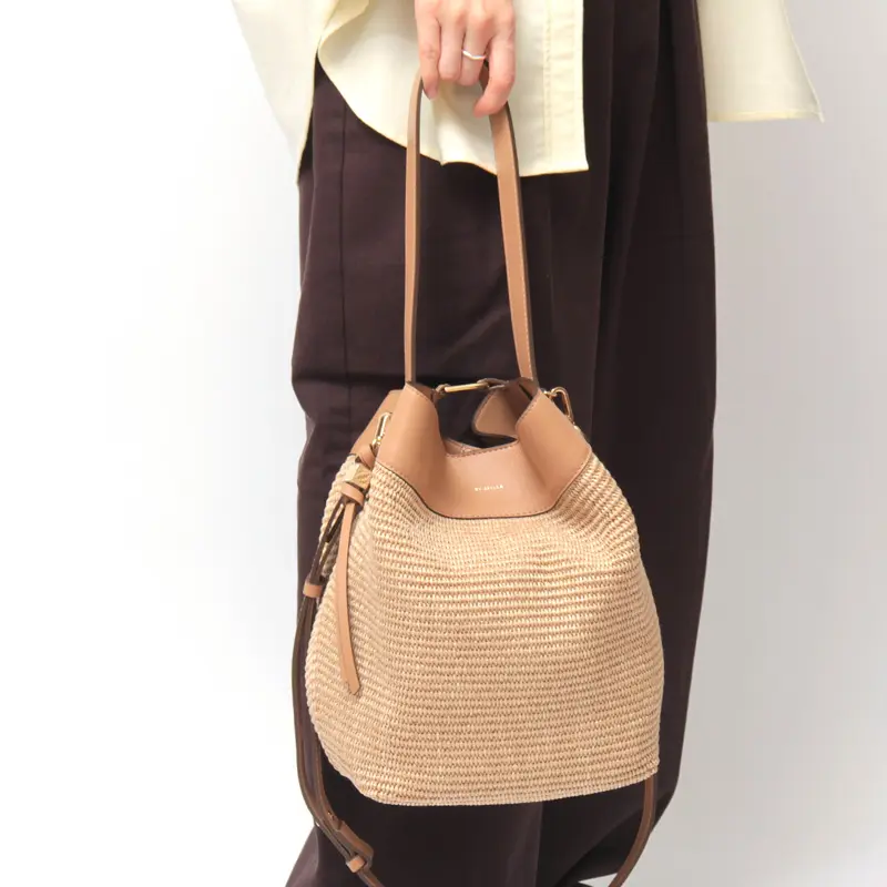 金具を留めることで、可愛い巾着型にスタイルチェンジできるLORISTELLA(ロリステッラ)の2wayハンドバッグ「EMMA」。涼しげなラフィア調の素材とレザーのコンビネーションが、洗練された大人のカジュアルスタイルを演出します。B5サイズが収まる実用性で、オンオフ活躍する逸品です。