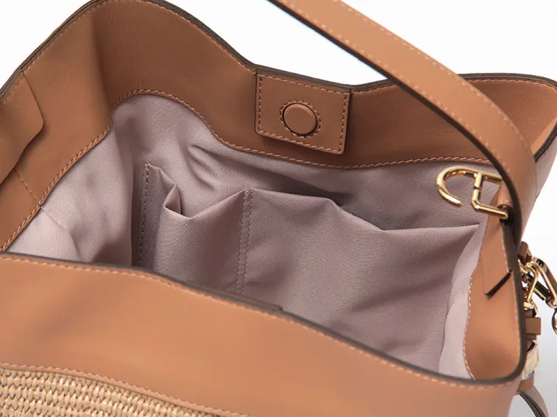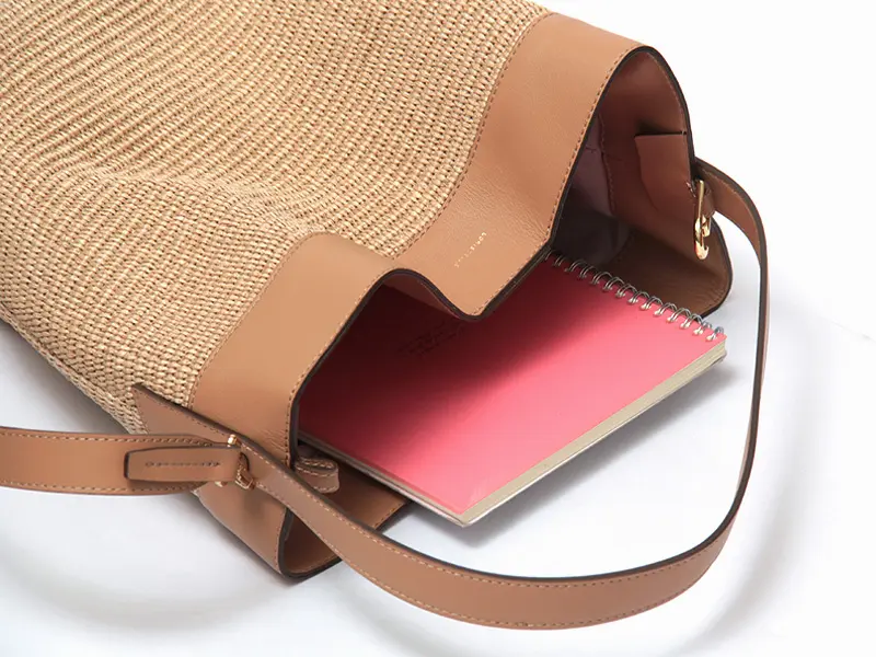 本体にはコットンとポリアミドを混紡した、高品質なイタリア製ラフィア調シートを採用。天然素材のようなナチュラルな風合いを持ちながら、引っ掛かりが少なく衣服を傷めにくいのが特徴です。天然ストローに比べて耐久性が高く、多少の水濡れにも強いため、天候を気にせずデイリーに愛用いただけます。