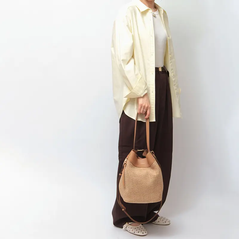 アクセサリー感覚で取り入れられるコンパクトなサイズ感。小柄な方でもバランスが取りやすく、斜めがけスタイルもスマートに決まります。「季節感は欲しいけれど、大きすぎるかごバッグは苦手」という方におすすめのボリュームです。