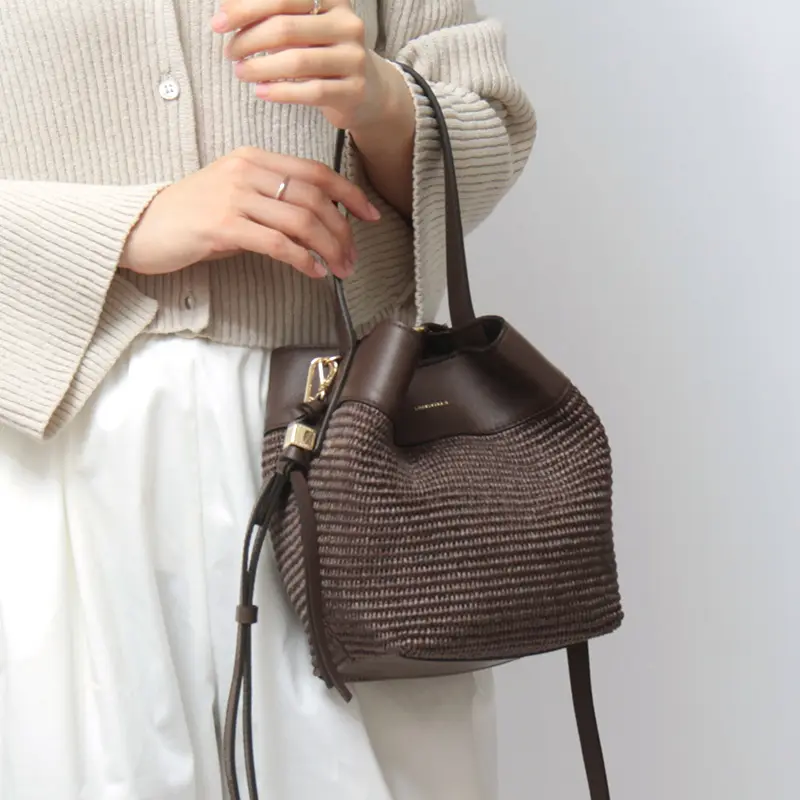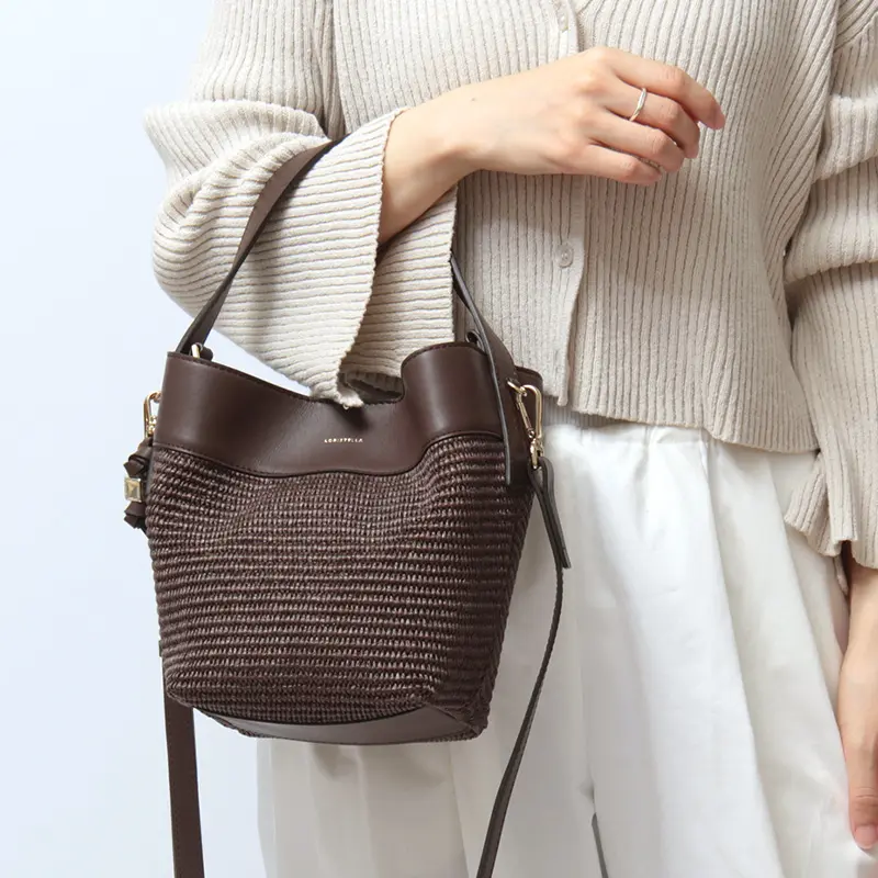 ナチュラルな編み素材とレザーのコンビが魅力のバケットバッグ。デイリーのお出かけから通勤まで、スタイルを選ばず使いやすいデザインです。軽やかなラフィア調素材が、天然素材にない程よい抜け感で、上品な季節感をプラス。きれいめな装いにも、カジュアルなデニムスタイルにも馴染みます。