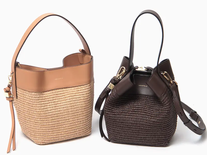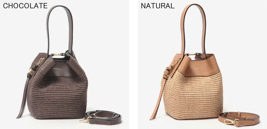 金具を留めることで、可愛い巾着型にスタイルチェンジできるLORISTELLA(ロリステッラ)の人気モデル「EMMA(エマ)」。季節感あふれるラフィア調素材と、高級感のあるイタリアンレザーを組み合わせた異素材コンビデザインです。上品なシルエットは、きれいめな装いから浴衣まで幅広くマッチ。コンパクトなSサイズながら、長財布や350mlペットボトルが収まる実用的な収納力を備えています。付属のショルダーストラップで斜めがけも可能な2WAY仕様で、夏の外出をクラスアップさせます。