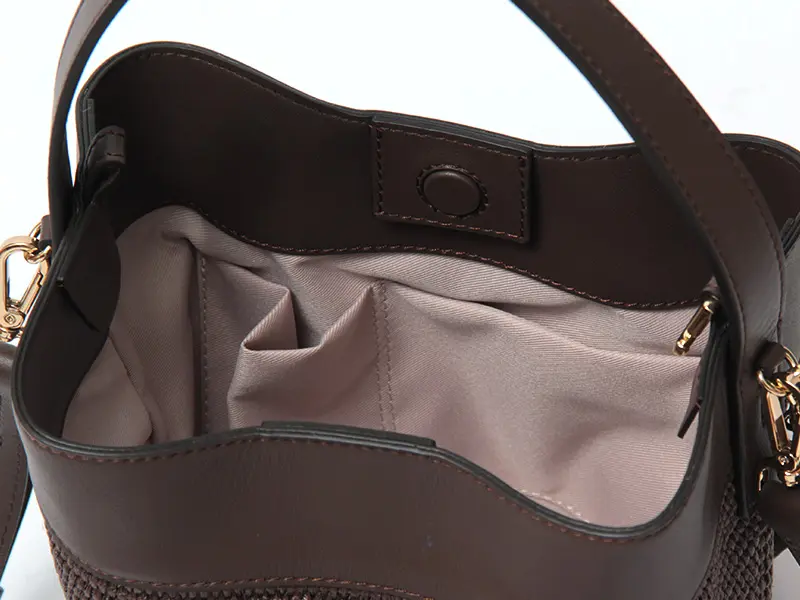 開口部はマグネット仕様で、荷物の出し入れもスムーズです。約11cmの広めな底マチを確保したバケツ型シルエットにより、長財布、350mlペットボトル(横向き)、眼鏡ケース、スマホといった必需品がすっぽりと収まります。内装には光沢のあるシャンタン生地を採用し、バッグを開けるたびに上質さを感じられる仕上がりです。