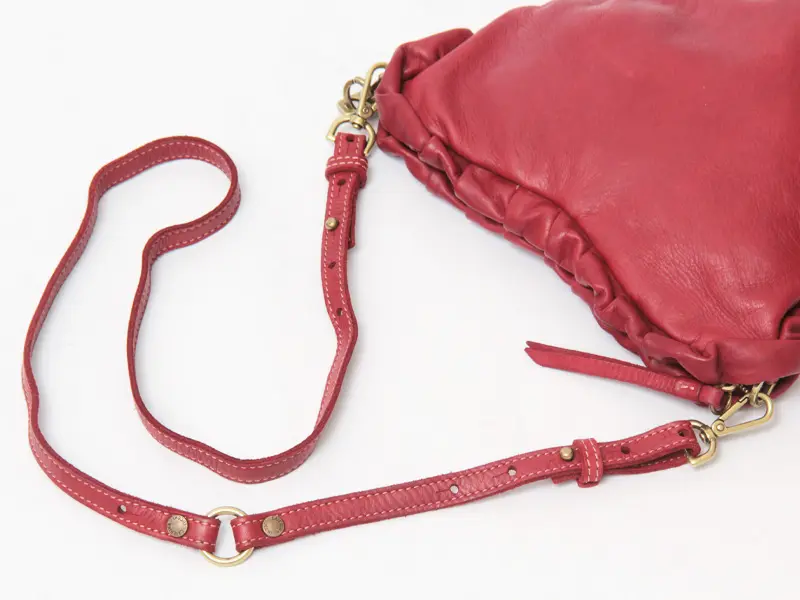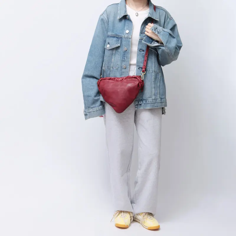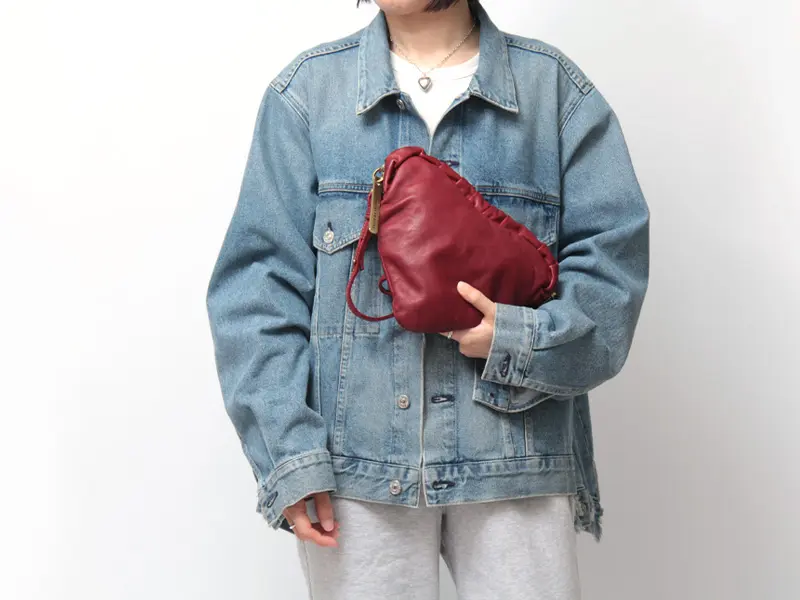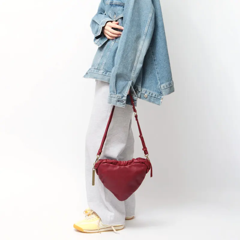 ハートフォルムが装いにさりげない遊び心を添え、シンプルなコーデのアクセントとしても映えるミニバッグ。ショルダーストラップは取り外し・長さ調整が可能で、斜め掛けや肩掛けなどシーンに合わせた持ち方に対応。ストラップのギボシをリング横の穴に留めることで、肩掛けしやすいバランスでもお使いいただけます。