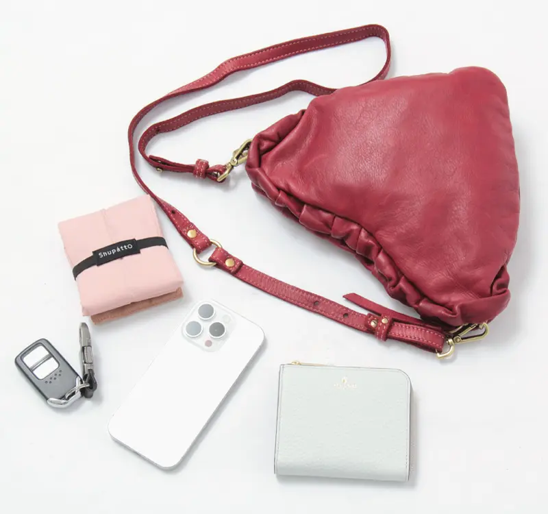 開閉はファスナー仕様で、中身をしっかりカバー。ミニ財布やスマホ、エコバッグ、鍵などの必需品がしっかり収まるサイズ感。背面内側にはファスナーポケットを備え、細かな小物もすっきり整理できます。