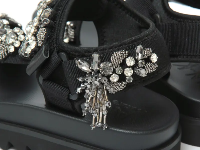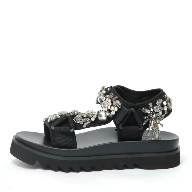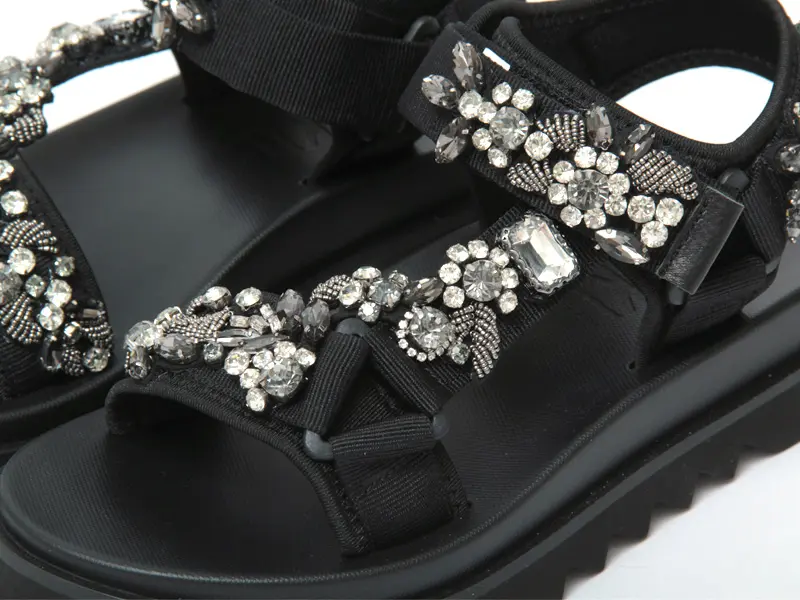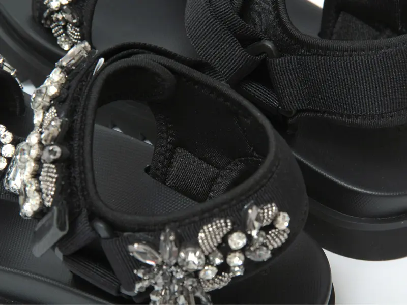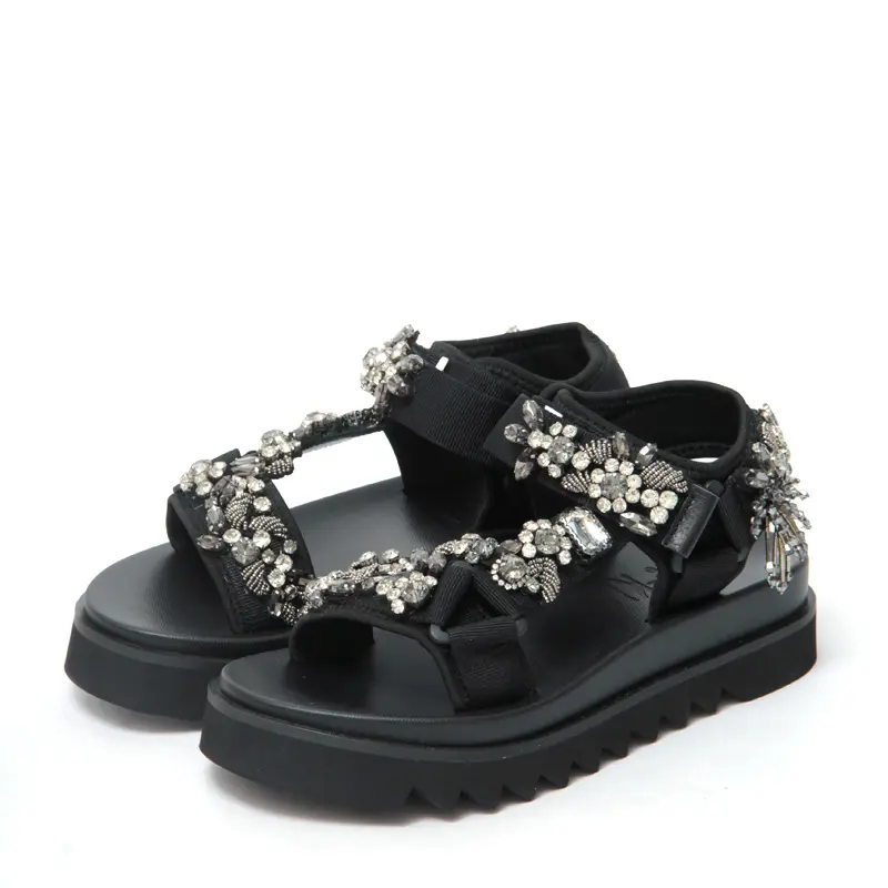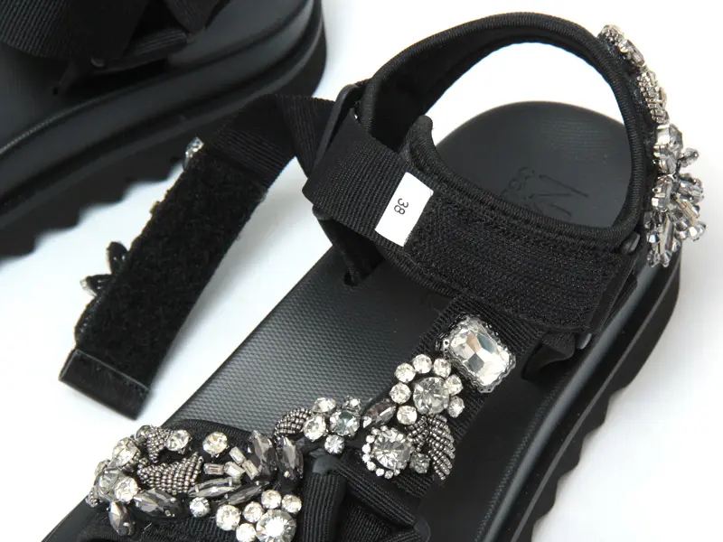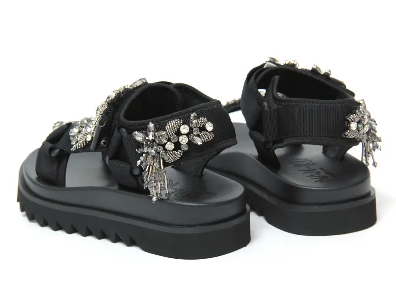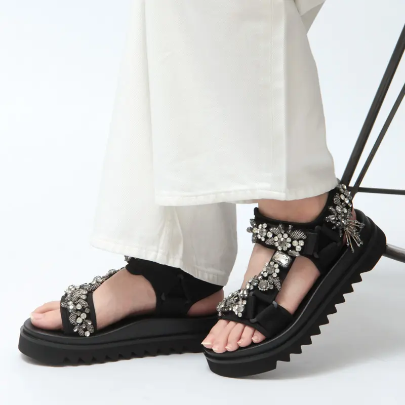 イタリア発のシューズブランド、NAN-KU Couture(ナンククチュール)の華やかなビジューとクリスタルの装飾が輝く厚底サンダル。キラキラのビジューをあしらったスポーツサンダルデザイン。足元に立体感とエレガントさをプラスし、カジュアルからきれいめまで幅広いコーディネートに映える一足です。快適な厚底ソールで歩きやすく、見た目も機能性も兼ね備えた夏の主役サンダルです。