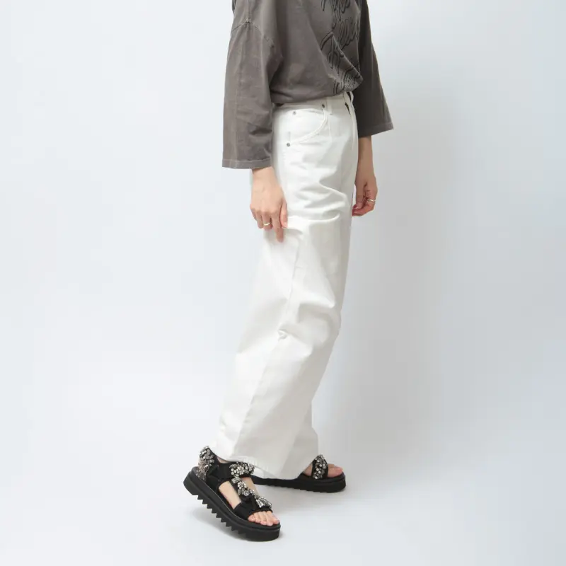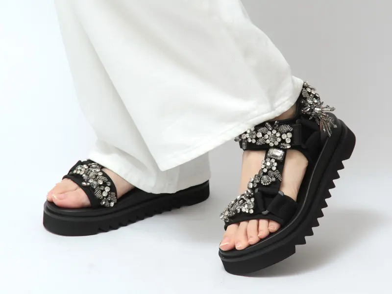 つま先に約3cmのプラットフォーム、かかと部分には厚底4cmを採用。足元に程よい高さをプラスし、スタイルアップ効果も期待できます。軽量設計で長時間の着用でも疲れにくく、厚底とプラットフォームのバランスが足元をスタイリッシュに演出。ビジューの華やかさとも調和し、夏のカジュアルからきれいめコーデまで幅広く活躍します。