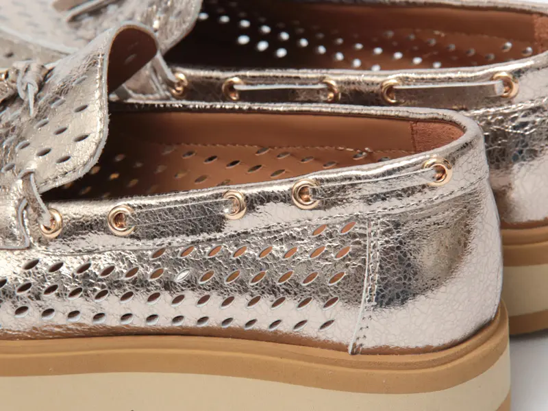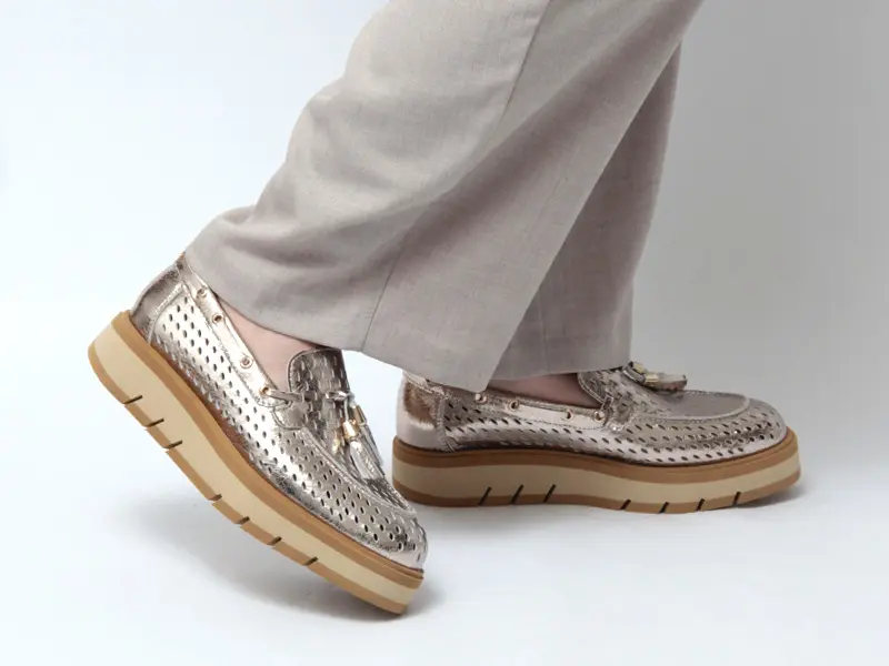甲部分にはタッセルをあしらい、クラシックなデザインに程よい華やかさをプラス。パンチングを施したメタリックレザーを使用することで、軽やかな抜け感と上品な光沢感を兼ね備えた仕上がりです。ゴールド系のカラーながら肌なじみがよく、スタイリングに自然に溶け込みます。