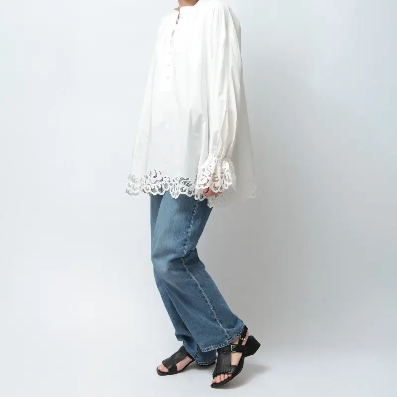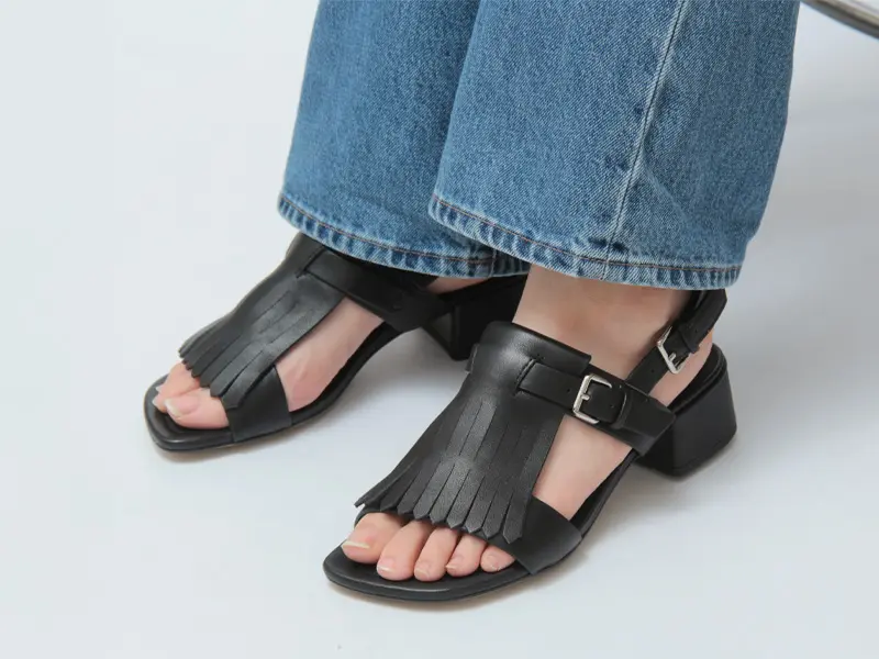 つま先はしっかりとしたスクエアトゥで、個性的な足元を演出。フリンジのデザインを引き立てながら、足元をバランスよく整えてくれます。アッパーには大ぶりのフリンジをあしらい、存在感のあるデザインに。立体感のあるディテールが、足元にさりげないアクセントをプラスします。レザーの上品な質感がフリンジの表情を引き立て、カジュアルすぎず大人っぽく仕上がっています。
