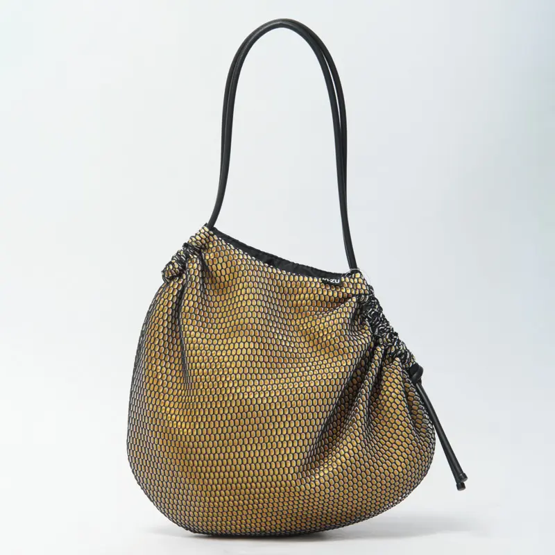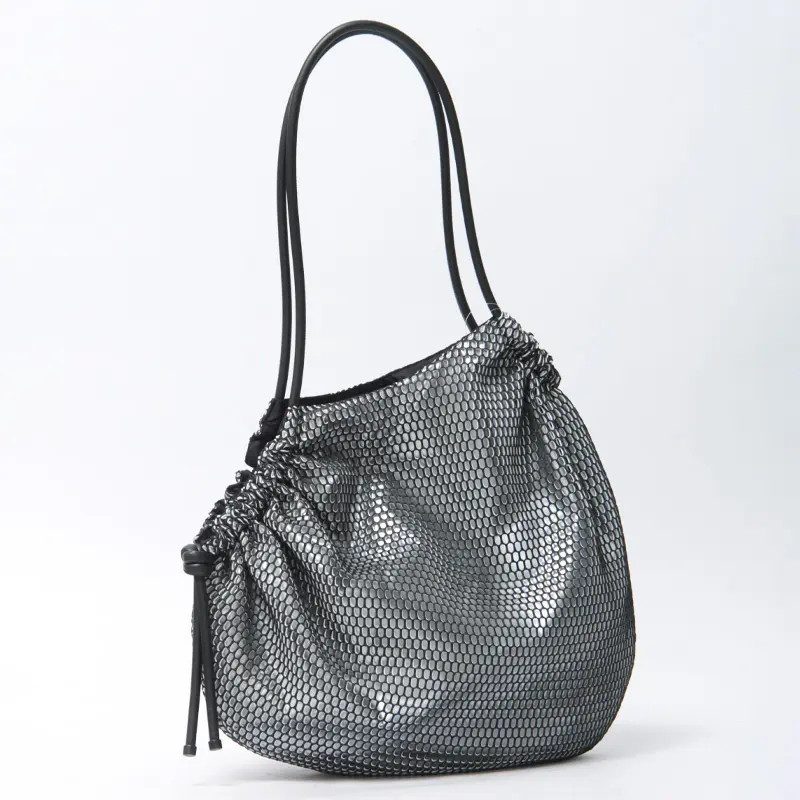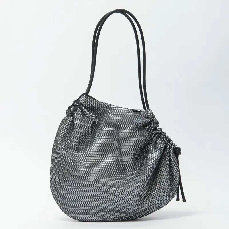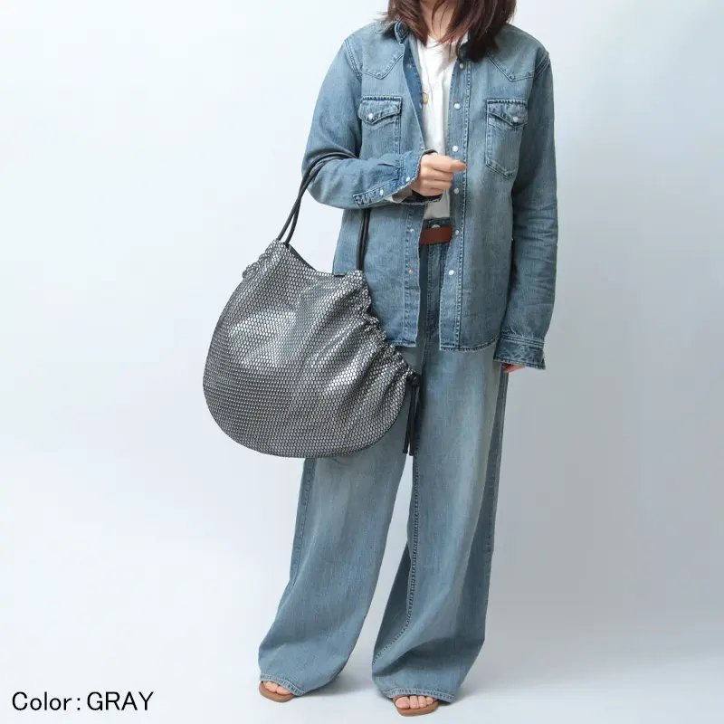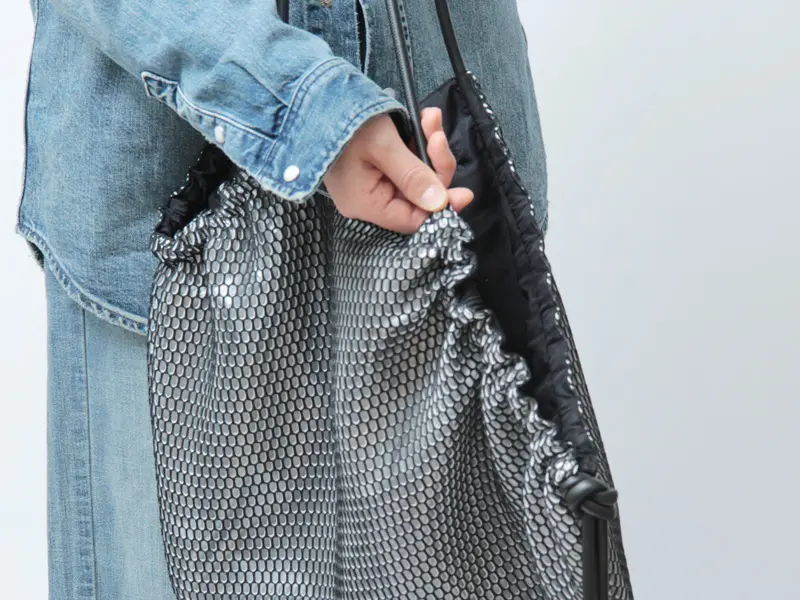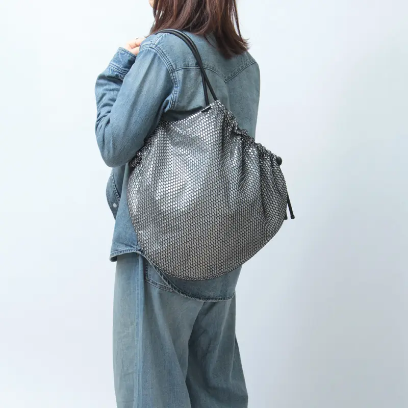 ゆったりと肩に掛けられる、やや長めに設計されたハンドルがポイント。肩掛けでも窮屈にならず、リラックスしたバランスで持てるのが魅力です。サイドにあしらわれたノット(結び目)デザインが、さりげないアクセントに。シンプルな中に、ほどよい個性を添えてくれます。