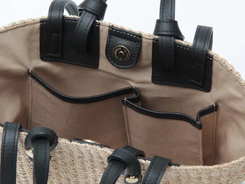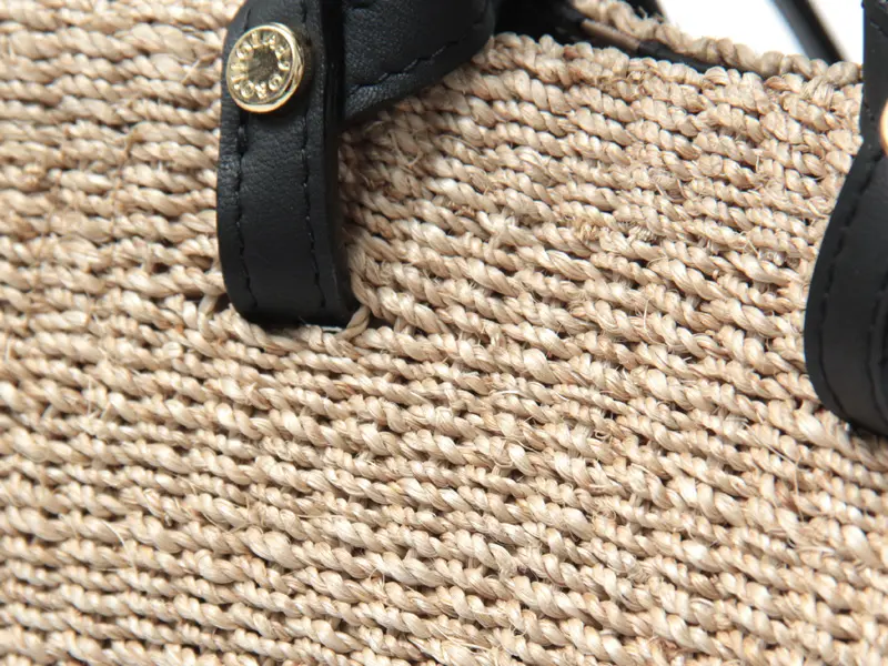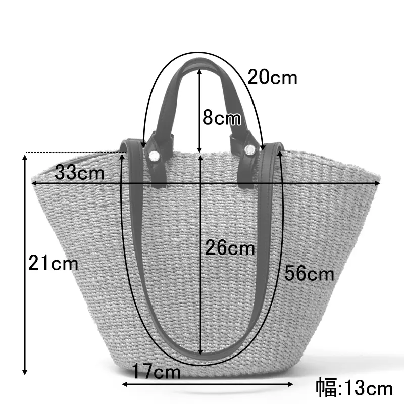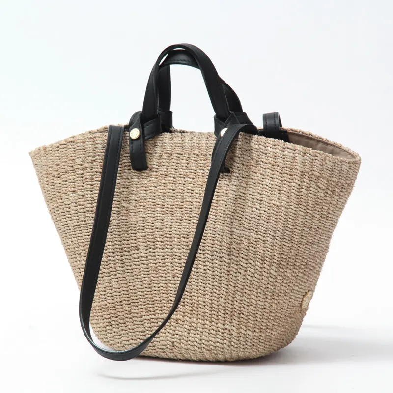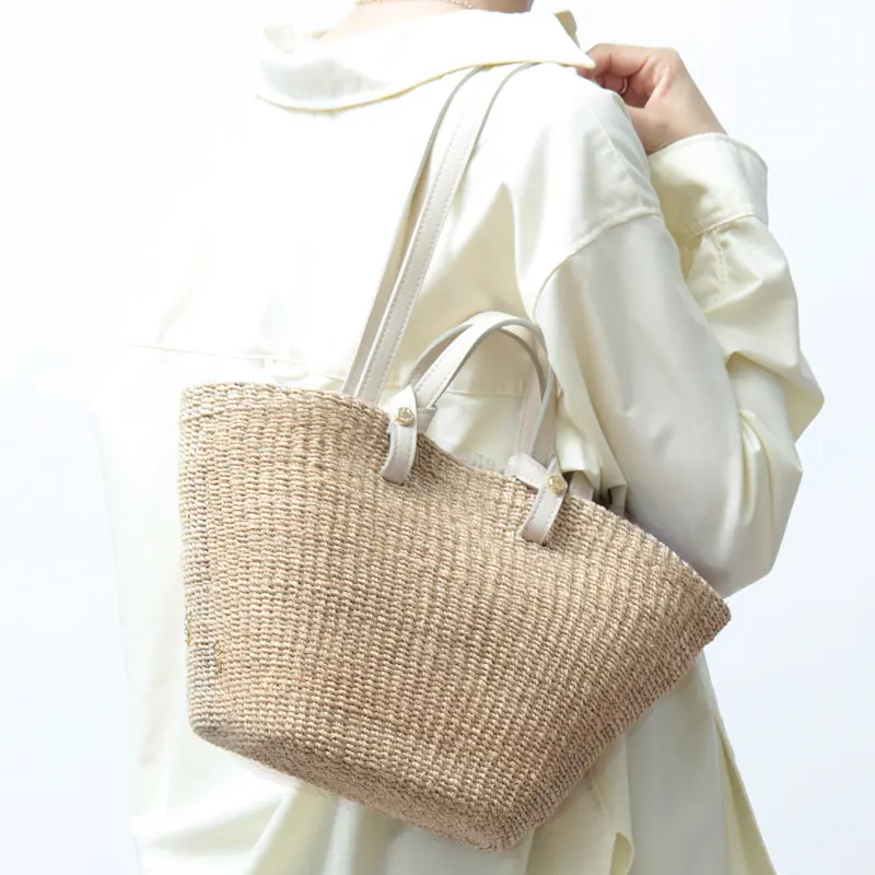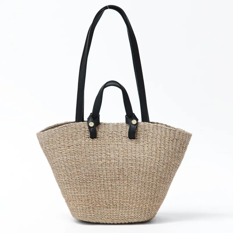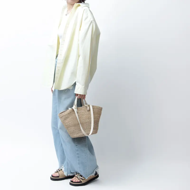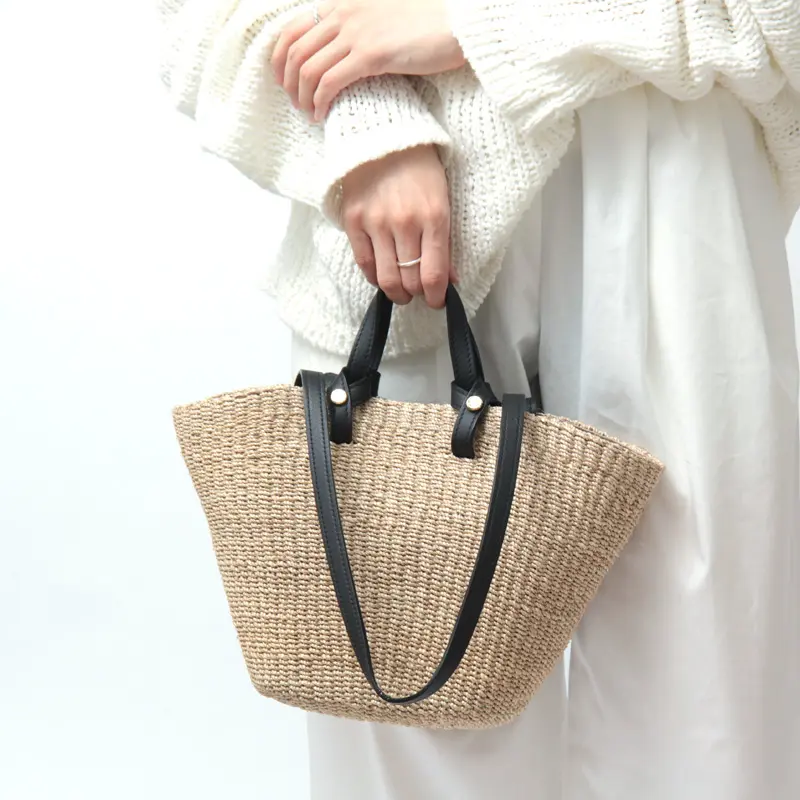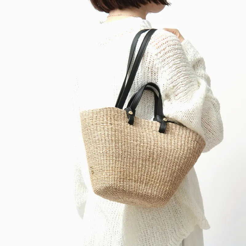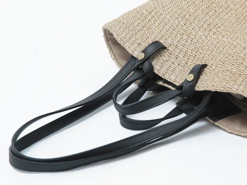 ナチュラルなアバカ素材に、レザーハンドルが程よいアクセントを添えたデザイン。異素材の組み合わせが上品さを引き立て、持つだけで洗練された印象に仕上がります。シンプルな装いにもすっと馴染み、大人のスタイリングをさりげなく格上げしてくれるアイテムです。