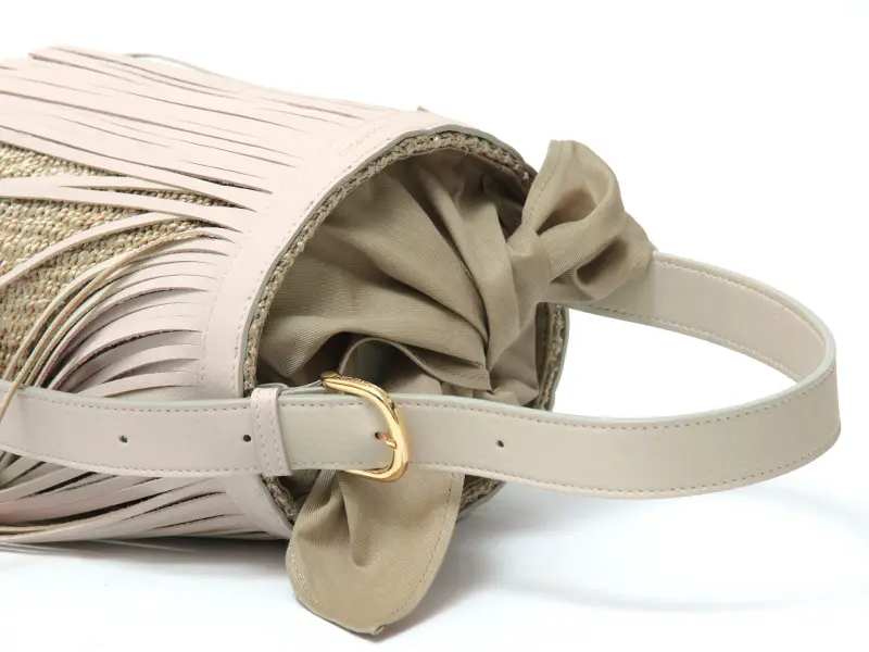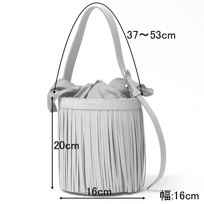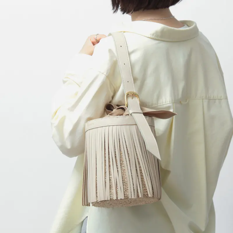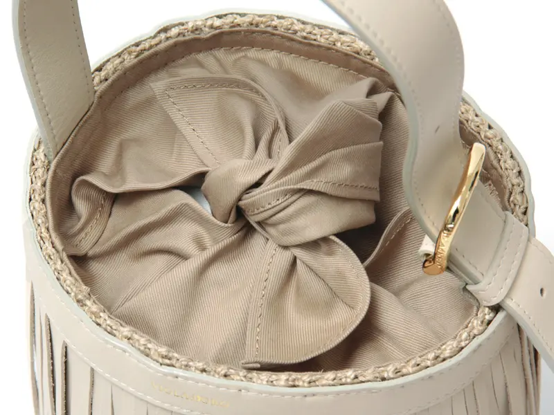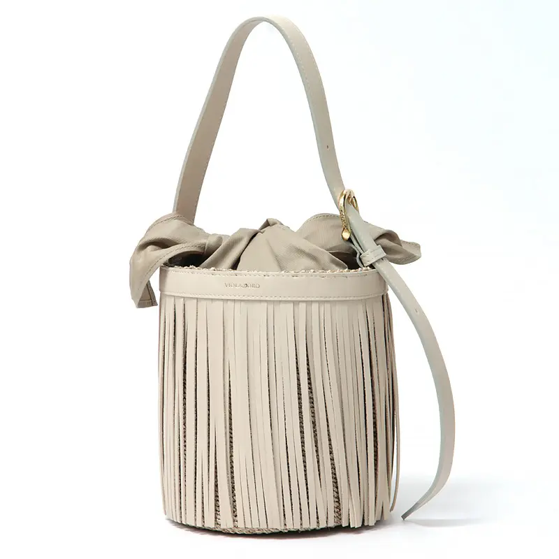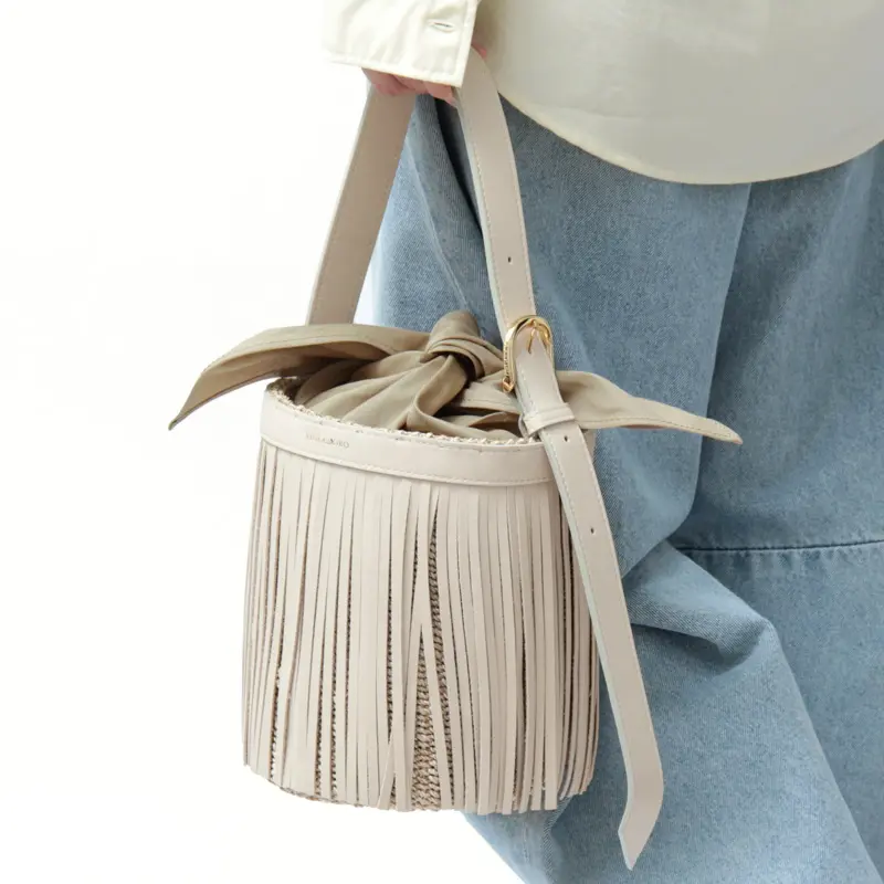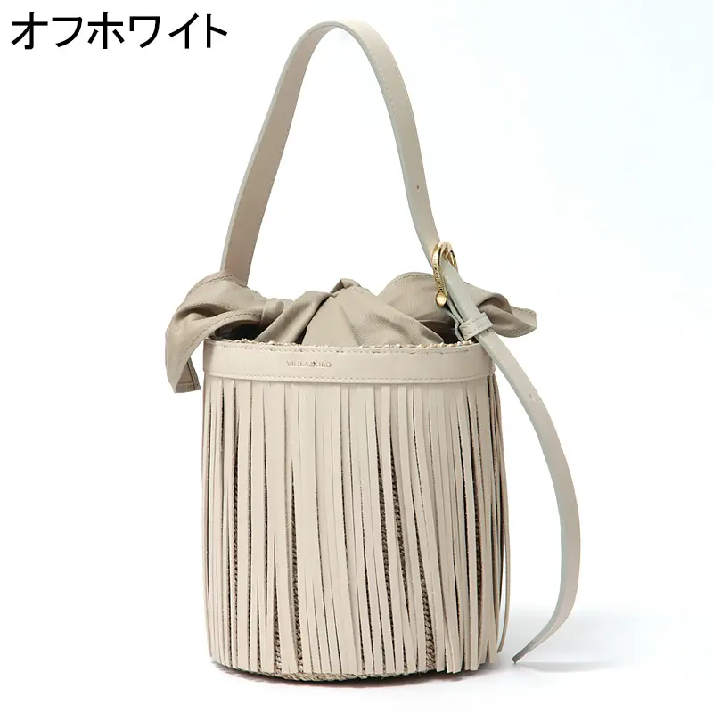 VIOLAd'ORO ヴィオラドーロ MIRO アバカ×レザー フリンジ付き バケツ型 かごバッグ V-9011 オフホワイト