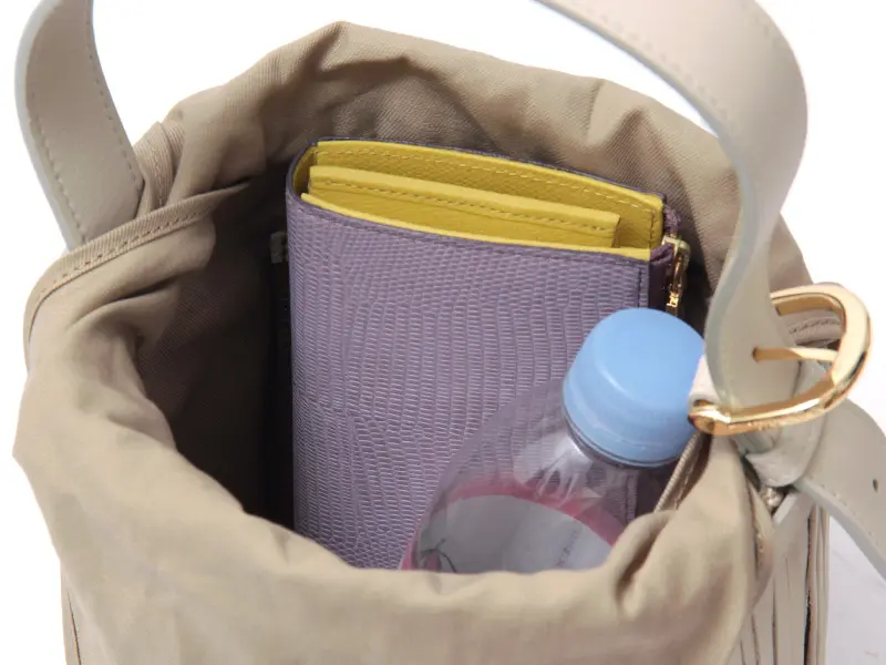 長財布やポーチ、500mlペットボトルなど、日常の必需品がすっきり収まる使い勝手の良いサイズ感。内ポケット付きで、ICカードやカギなどの小物の収納に便利です。