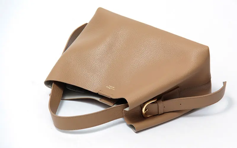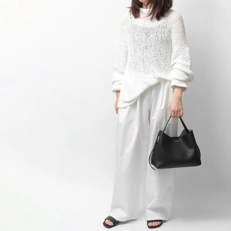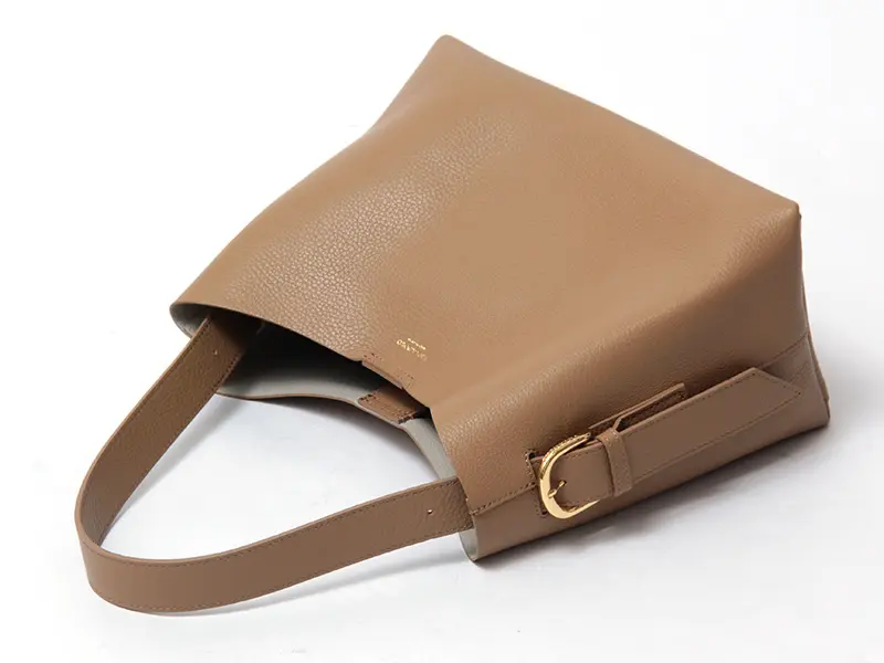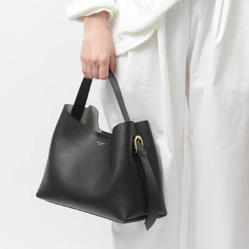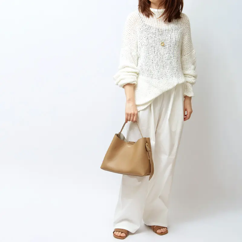 サイドのベルトでハンドルの長さを簡単に調節できます。コンパクトに手提げで持つスタイルや、厚手のコートの上からでもスマートに肩掛けできるロングハンドルスタイルなど、荷物の量や装いに合わせて最適なバランスでお使いいただけます。