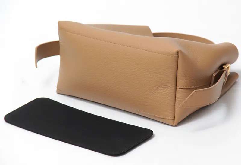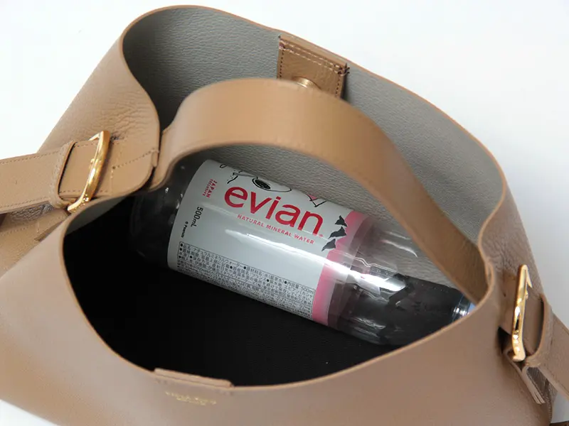 開口部はマグネット仕様で、荷物の出し入れもスムーズです。長財布、手帳、500mlペットボトルが横向きにしっかり収まる収納力を備えつつ、底板があることで重い荷物を入れても型崩れしにくい設計。安定感のある使い心地を叶えました。