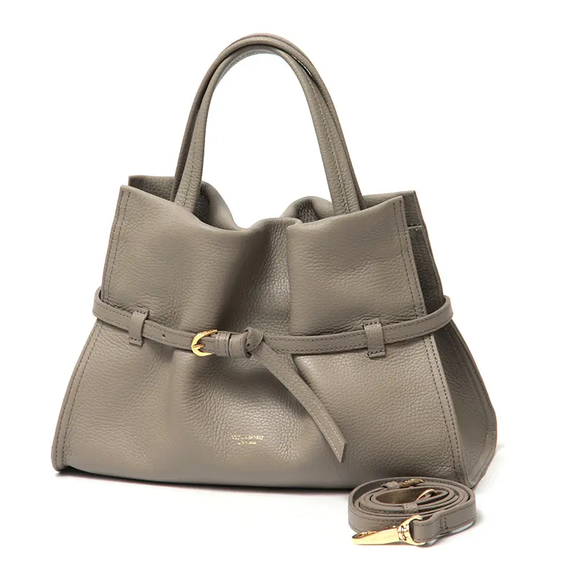 上品なシボ感のシュリンクレザーと、驚くほどの軽さが魅力のVIOLAd'ORO(ヴィオラドーロ)で人気の「TRERO トレロ」シリーズ。ハンドバッグ V-1630は、フロントのベルトを絞ることで生まれる優美なギャザーが、大人の女性にふさわしい柔らかさと品格を演出。長財布や500mlペットボトル、手帳もすっきり収まる安心のキャパシティで、デイリーからお出かけまでシーンを選ばず活躍します。