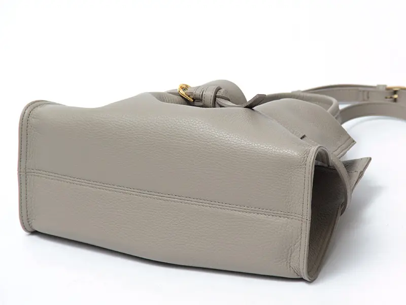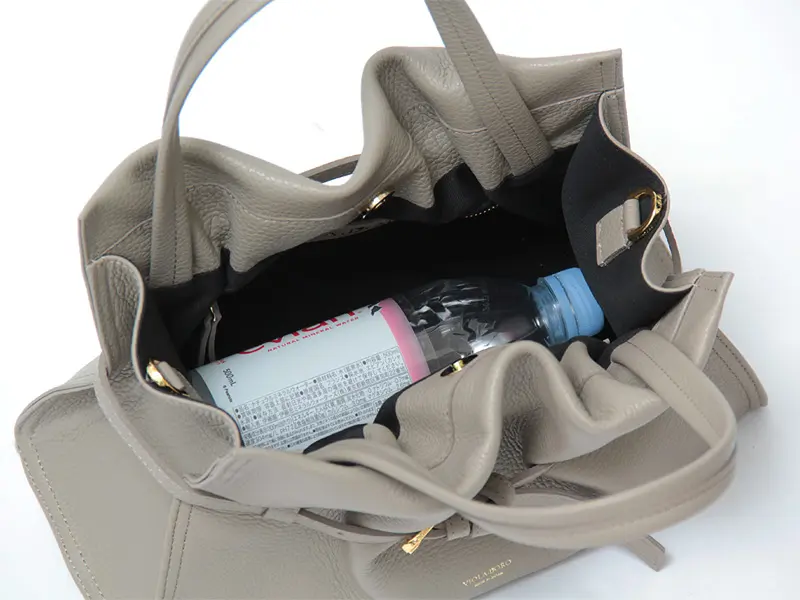 開閉はスムーズなマグネット仕様。広めのマチにより、長財布や500mlのペットボトルも横向きに安定して収まります。内蔵された底板が荷物の重みによる型崩れを防ぎ、常に美しいシルエットをキープ。