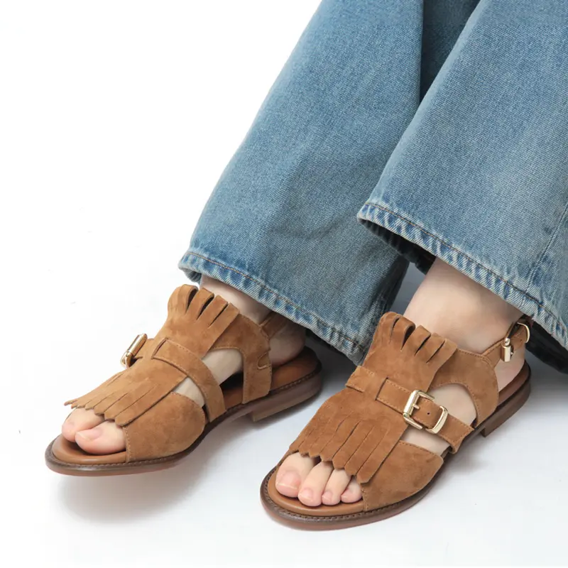 イタリア発のシューズブランド、Luca Grossi(ルカグロッシ)より、ボヘミアンのエッセンスをさりげなく取り入れたフリンジサンダルが登場。やわらかなスエード素材に、動きを抑えたフリンジデザインが奥行きをプラスし、ラフになりすぎない大人の足元に仕上げます。キャメルカラーとゴールドバックルが全体を引き締め、シンプルなスタイリングにも自然になじむ一足です。