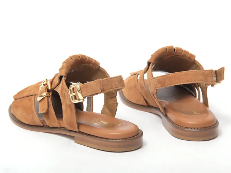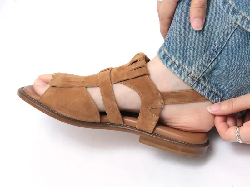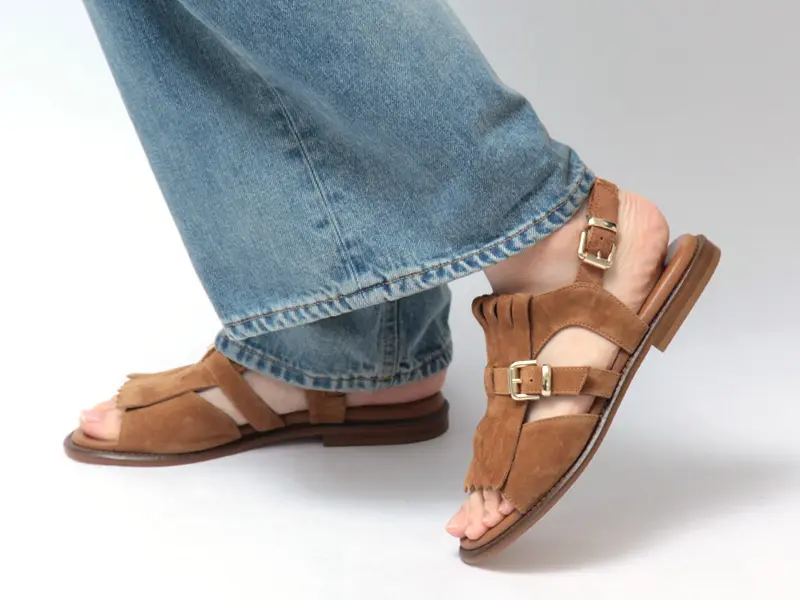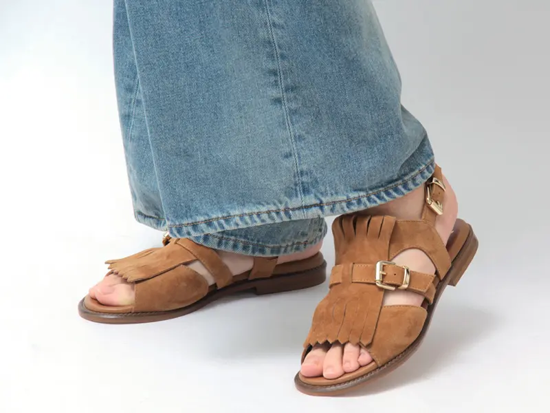 やわらかなスエード素材を使用したアッパーは、フリンジデザインをあしらうことで奥行きのある表情に仕上げています。動きを抑えたフリンジが足元に自然な抜け感を生みつつ、ラフになりすぎない印象に。さらに、アッパーに施されたベルトデザインが全体を程よく引き締め、大人のスタイリングにもなじむバランスに仕上がっています。