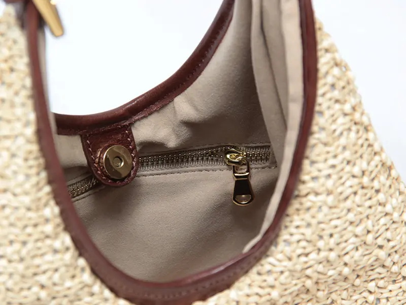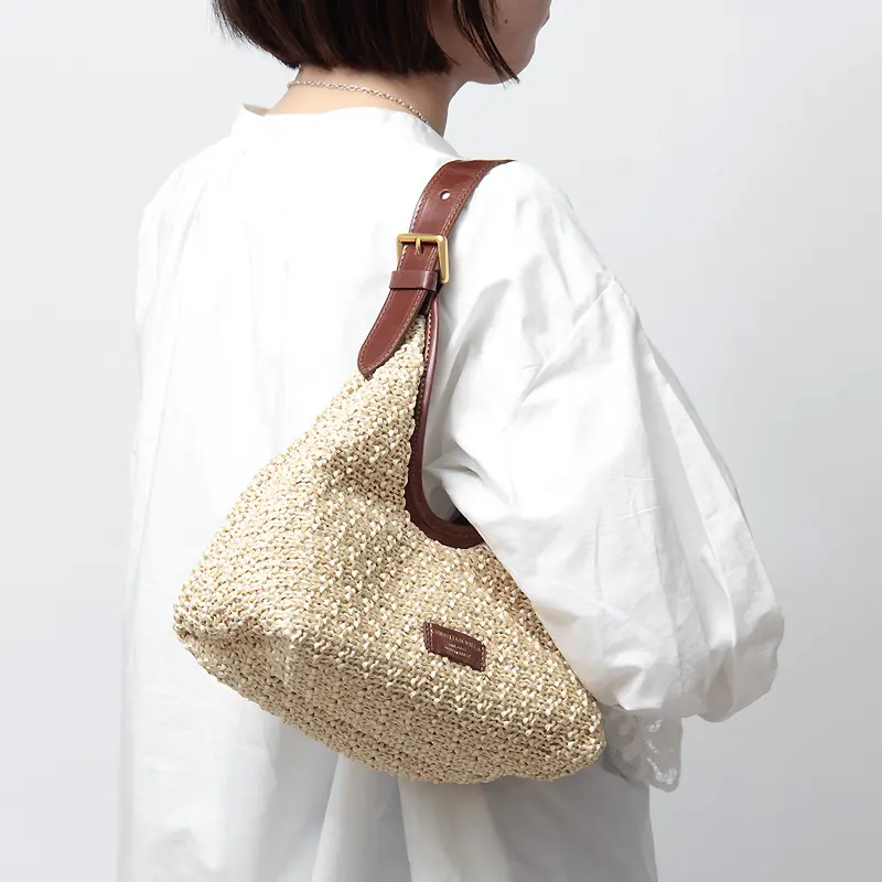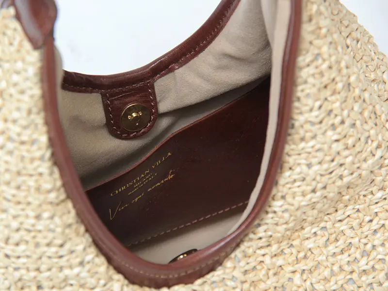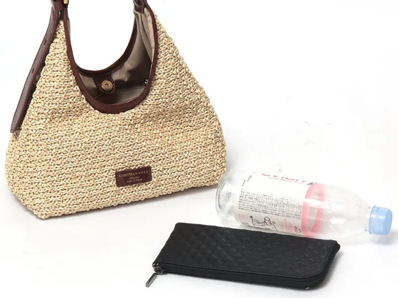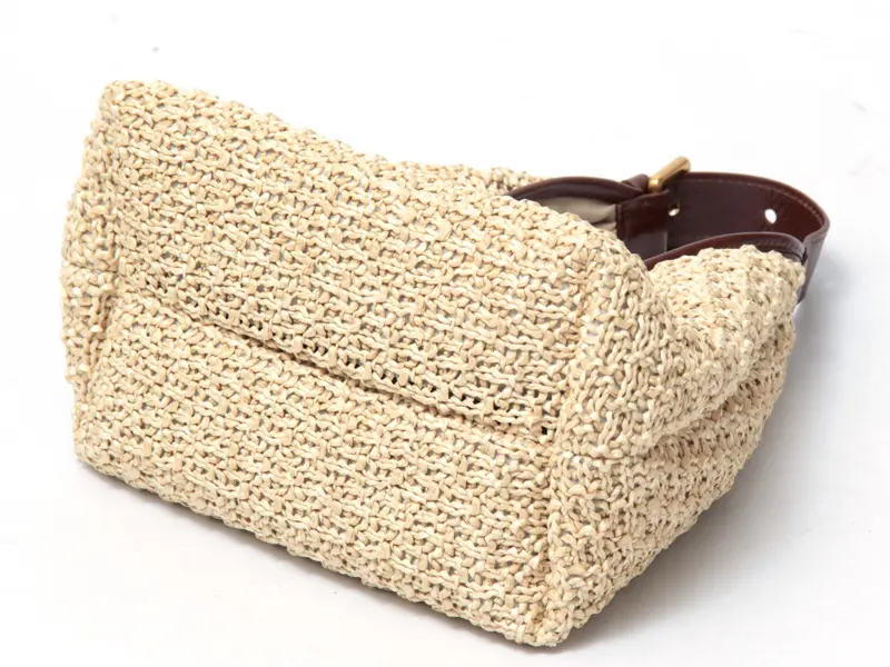 本体には、丁寧に編み込まれたラフィア(天然繊維)を使用。ハンドメイドのようなクラフト感がありながら、非常に軽量で持ち疲れしにくいのが魅力です。 このナチュラルな素材にレザーを贅沢に組み合わせることで、都会的なエッセンスをプラス。職人の矜持を感じさせる、上質なマテリアルのハーモニーをお楽しみください。
