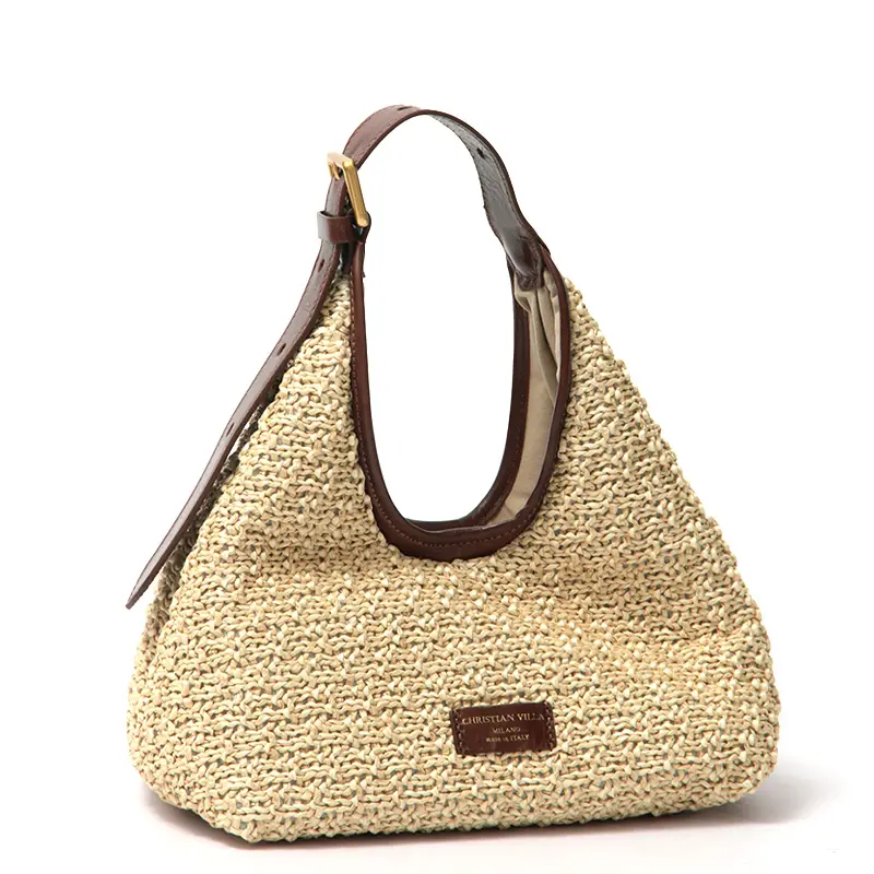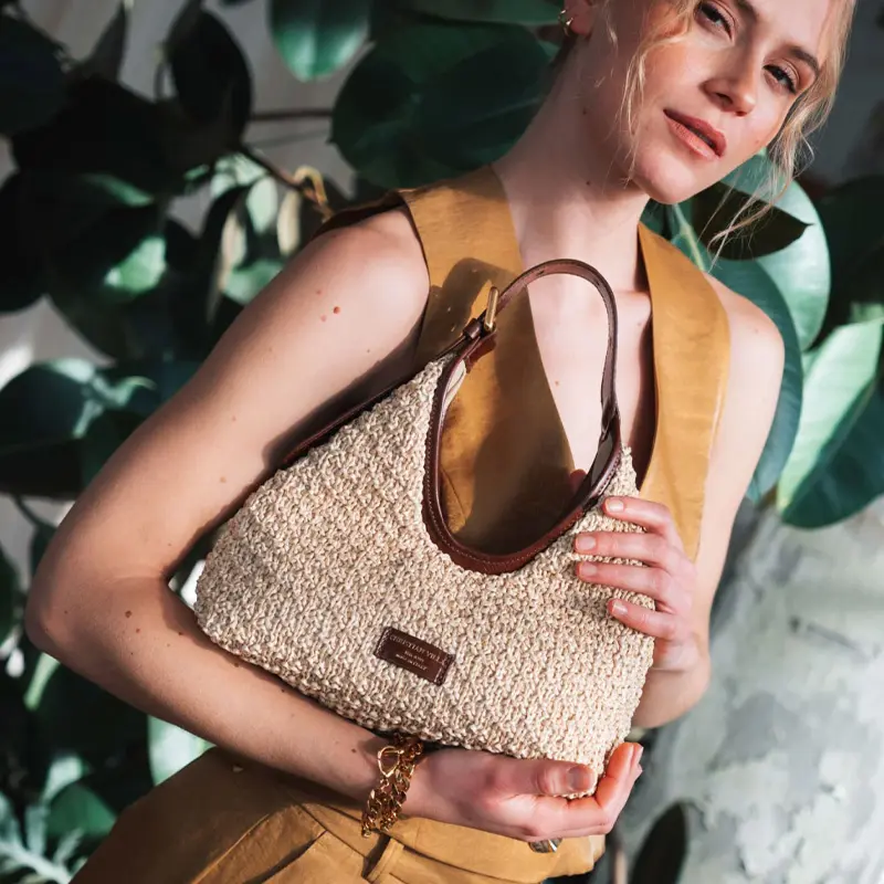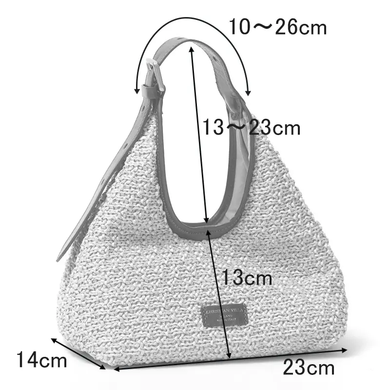 イタリアのバッグブランド、CHRISTIAN VILLA(クリスチャンヴィラ)より、手仕事の温もりを感じるマクラメ編みの「ALMA(アルマ)」スモールサイズ。 涼やかなラフィア調の質感と、洗練されたトライアングルシルエットが特徴です。ハンドルに上質なレザーを配することで、カジュアルな中にも大人の気品が漂うデザインに仕上げました。軽量ながらもしっかりとしたマチを備え、日常の必需品をスマートに持ち運べる、実用性と美しさを兼ね備えた逸品です。