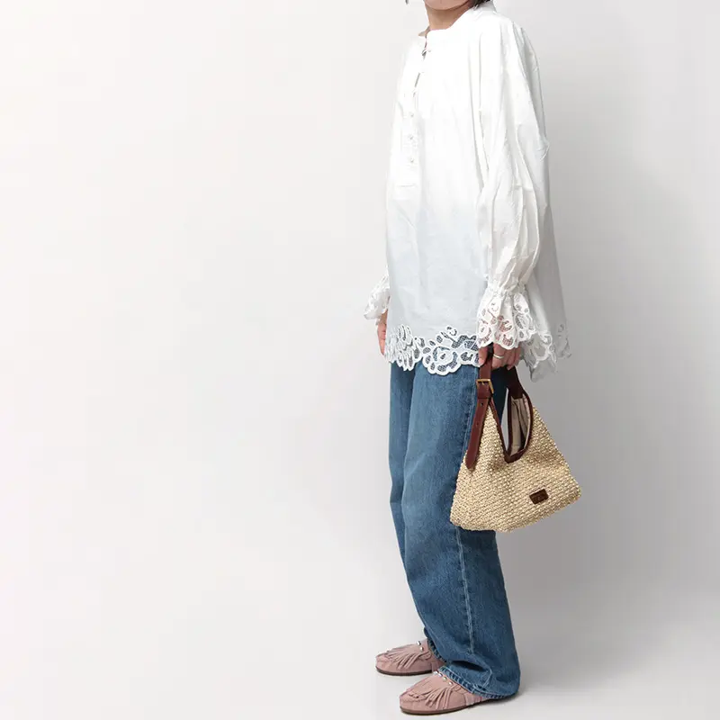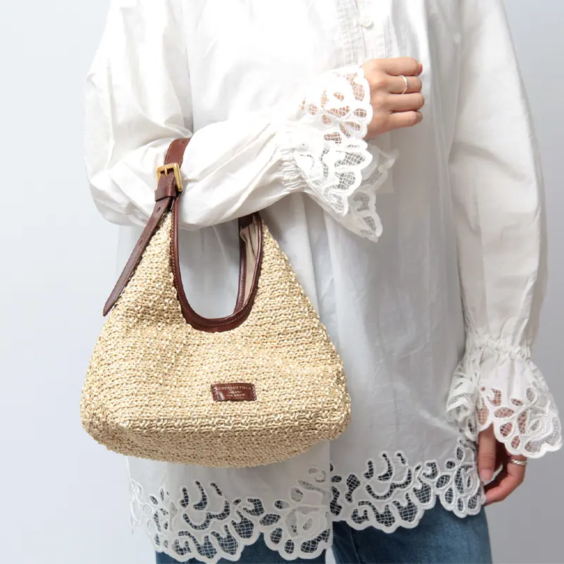ナチュラルな風合いが魅力のラフィアバッグは、春夏のコーディネートの主役として活躍します。 デニムと合わせた軽やかなデイリースタイルはもちろん、リネンワンピースなどのリゾートスタイルにも優雅にマッチ。本革のトリミングが全体を程よく引き締めるため、ラフになりすぎず、街歩きやランチシーンでも品よく映える佇まいです。