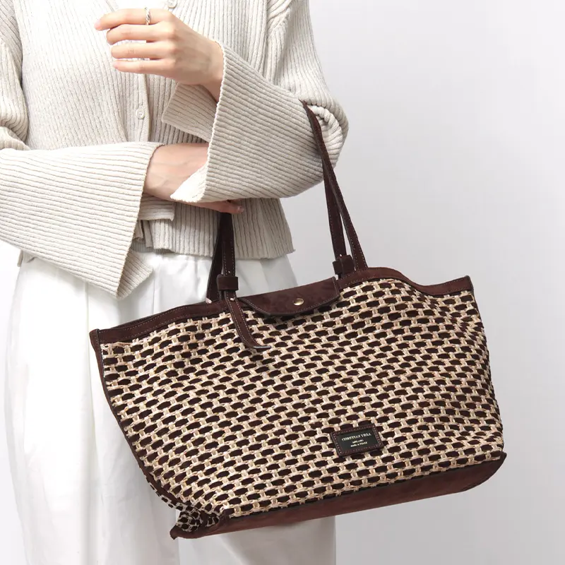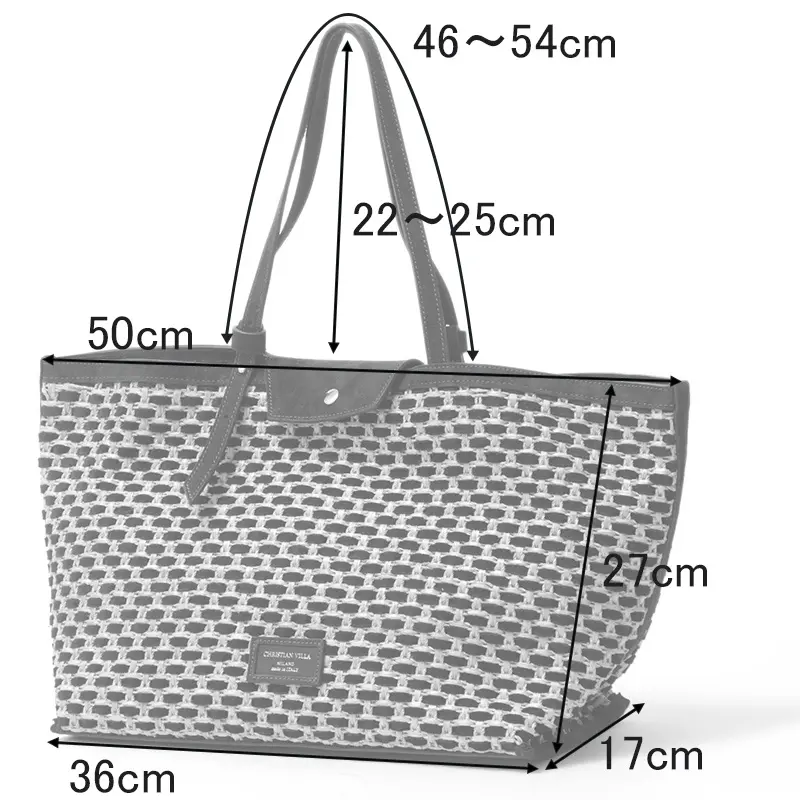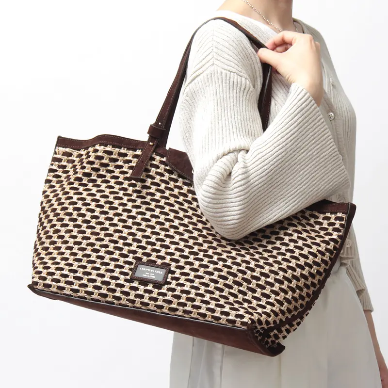 ナチュラルなラフィア素材と、しっとりと温かみのあるスエードを贅沢に編み込んだ、CHRISTIAN VILLA(クリスチャンヴィラ)のメッシュトートバッグ「6431」。緻密に編み込まれたイントレチャートのデザインは、隙間がなく中身が透ける心配もありません。A4サイズもしっかり収まる実用性と、イタリア製ならではの軽やかな高級感を両立した、オンオフ問わず活躍する逸品です。