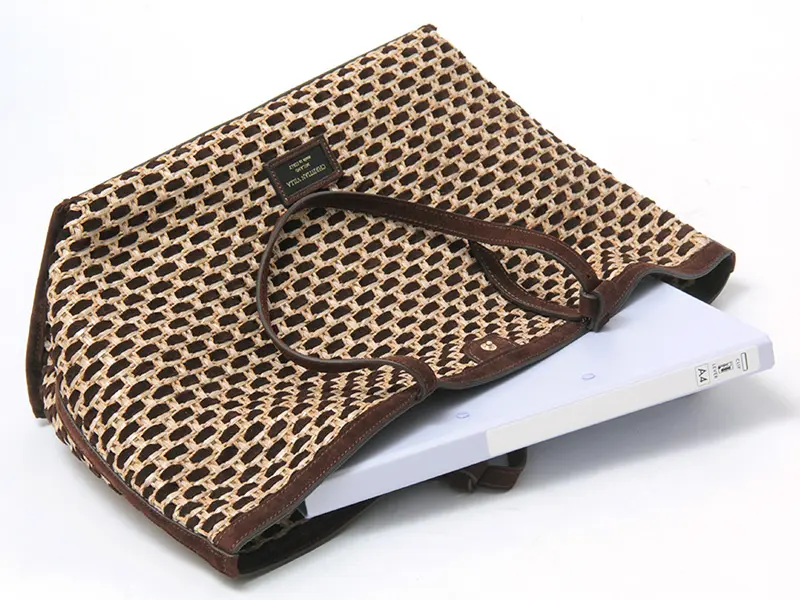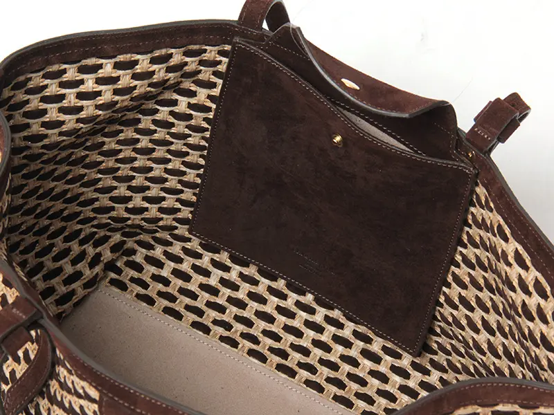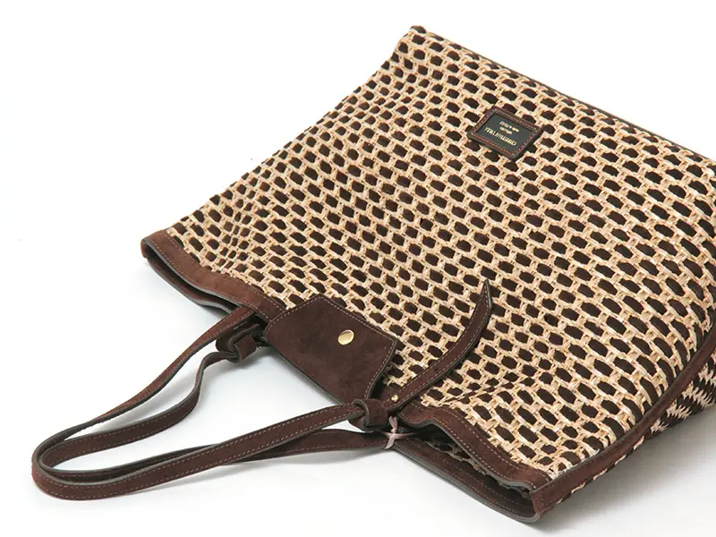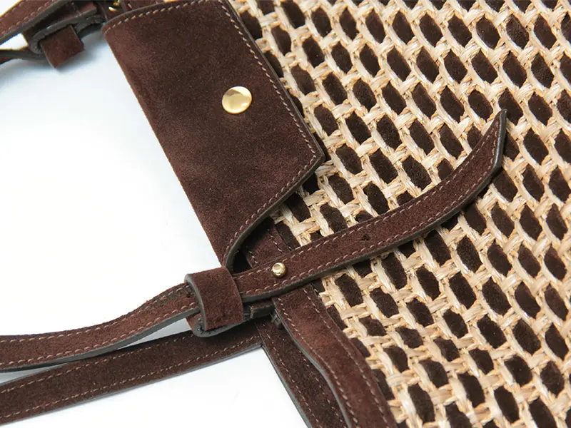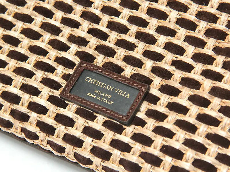 ラフィアのナチュラルな風合いと、滑らかなスエードの質感を贅沢にミックス。透け感のない密なイントレチャート(編み込み)は、丈夫でありながら驚くほど軽い仕上がりです。細部までこだわり抜かれたイタリア製のクラフトマンシップを、ぜひお手元で実感してください。