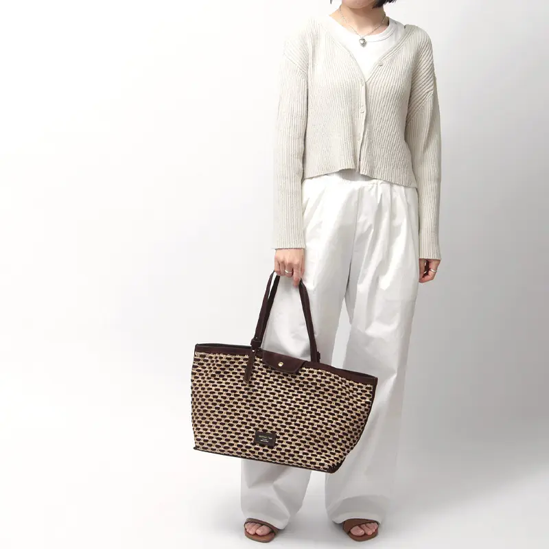 ラフィアのベージュとスエードのブラウンが織りなす落ち着いた配色は、毎日の通勤から休日のお出かけまで幅広くマッチ。デニムを合わせたカジュアルなスタイリングはもちろん、リネンワンピースに合わせたリゾート感のある装いまで、持つだけで洗練された大人の印象に。春先から秋口まで、季節を跨いで長く愛用いただけます。