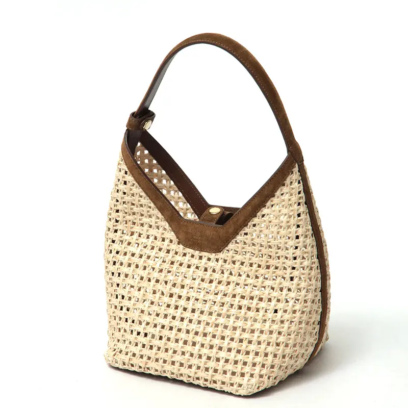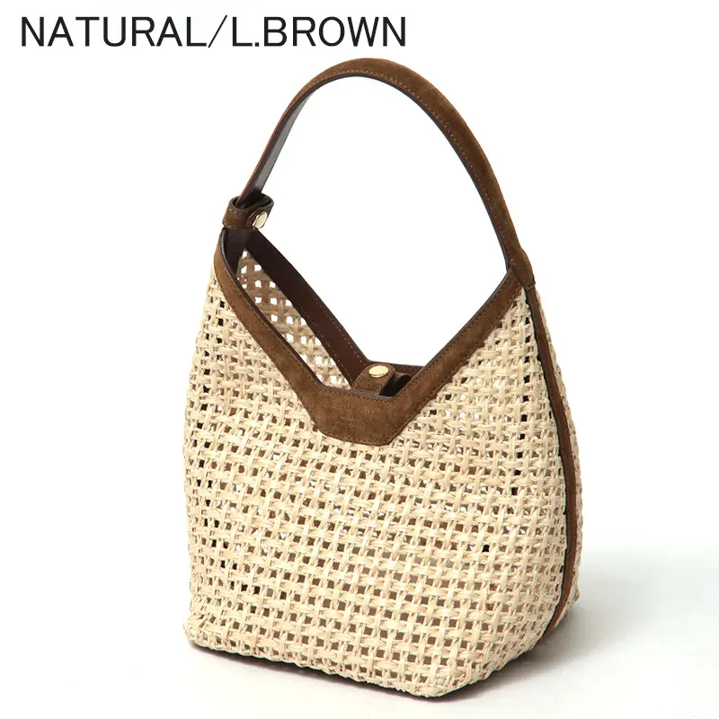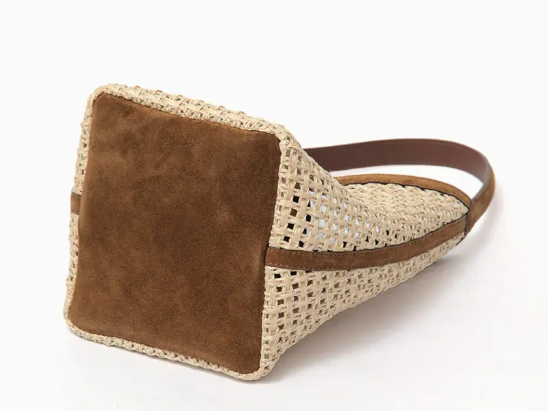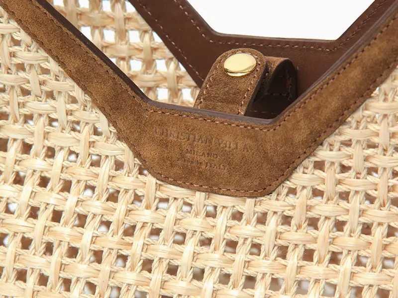 清涼感あふれるラフィアと、贅沢なスエードレザーのコンビネーションがクラス感を演出します。天然樹脂を豊富に含むラフィアは、使い込むほどにしなやかな風合いへと変化。トリミングやハンドルに配されたレザーが、ナチュラルな素材感にイタリアブランドらしいエッジを効かせています。