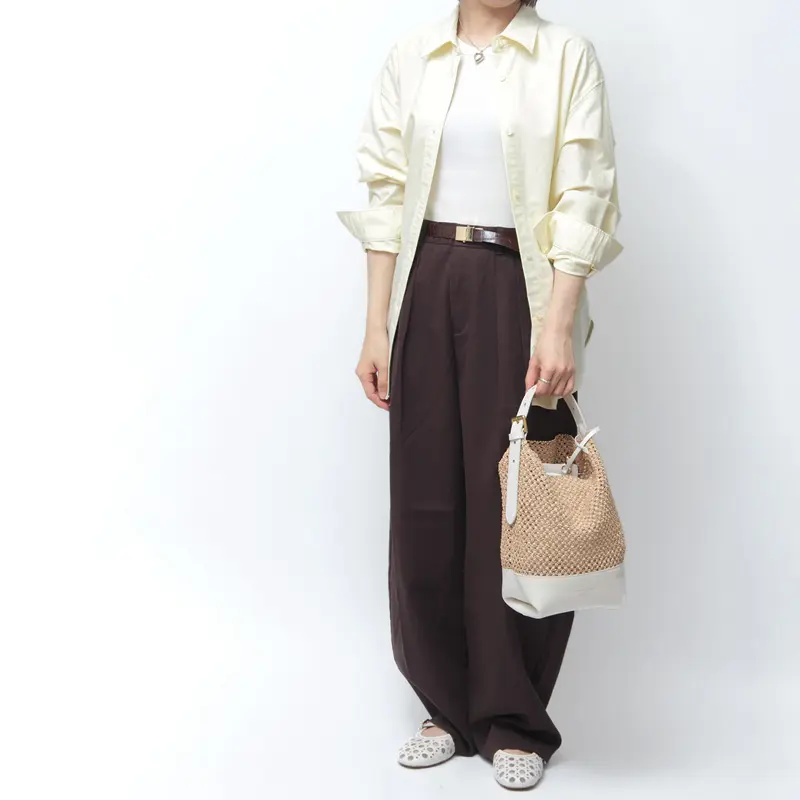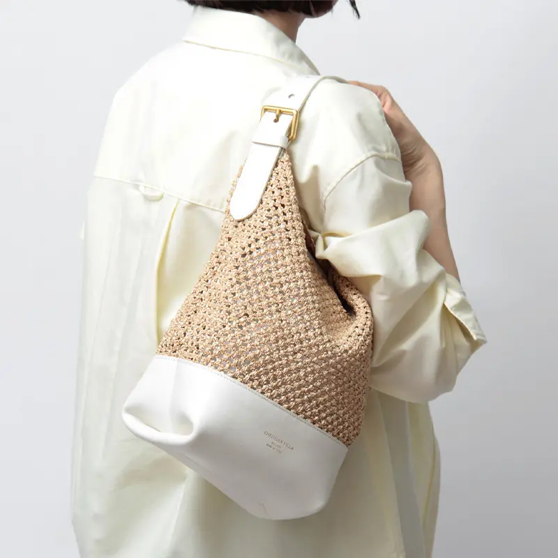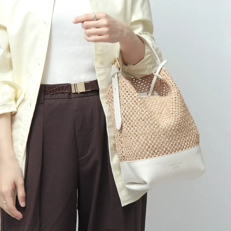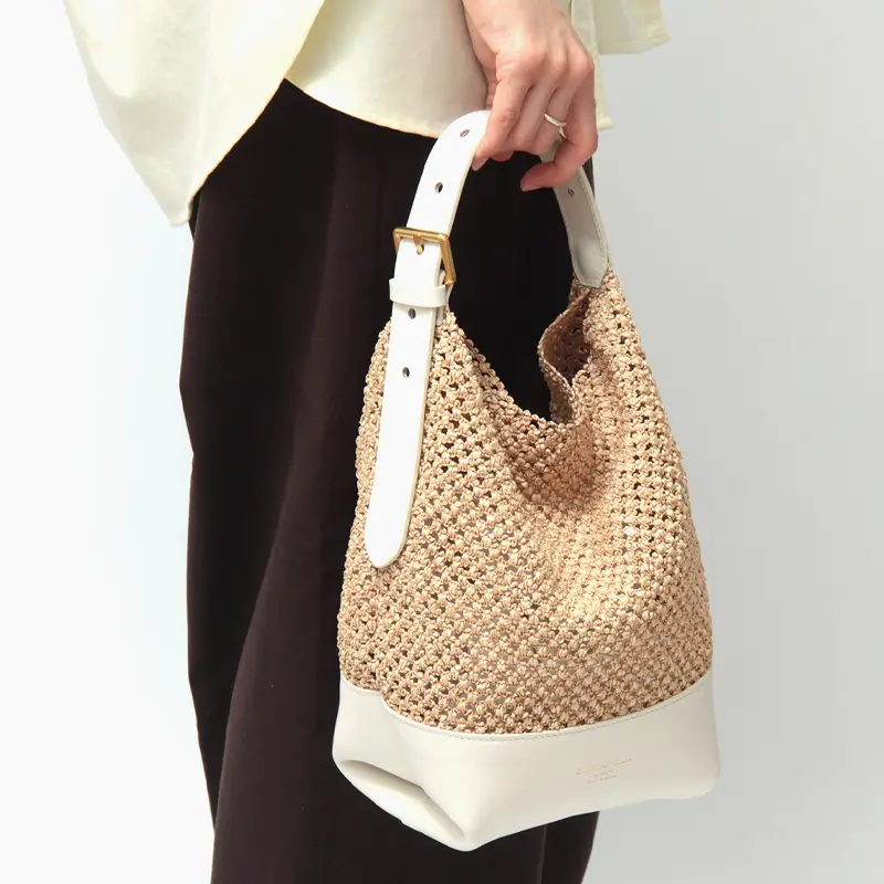 涼しげなナチュラル素材のバッグは、これからの季節の必需品。デニムを合わせたデイリーな装いから、リネンワンピースが主役のリゾートスタイルまで、どんなコーディネートにも溶け込みます。上質なレザーパーツが全体にメリハリを与えるため、ラフになりすぎず、街歩きやランチシーンでも品よく映える佇まいに仕上げました。