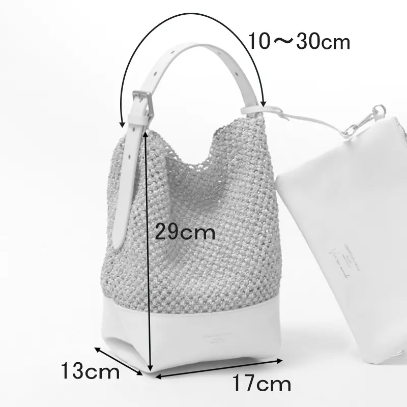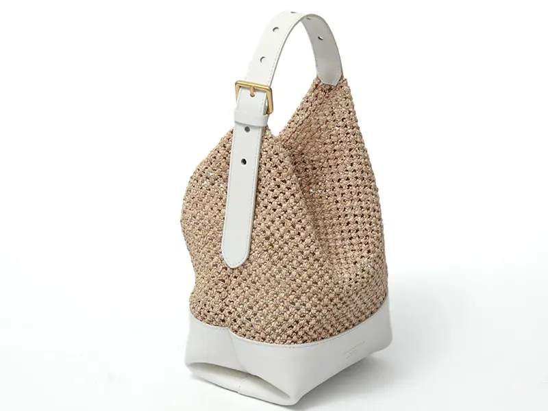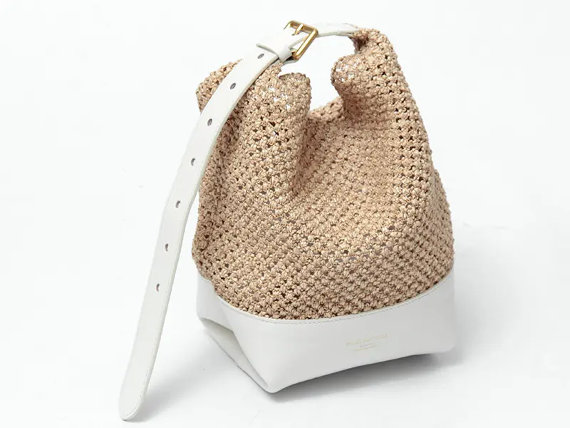 ボディには、清涼感たっぷりのストロー調クロシェ編みを採用しました。職人の技が光る複雑な編み目が、表情豊かなニュアンスを生み出します。底面やハンドルにレザーを配することで、バッグ全体の強度を高め、美しいフォルムをキープ。異素材のコントラストが洗練された印象を与え、大人の女性が長く愛用できる逸品です。